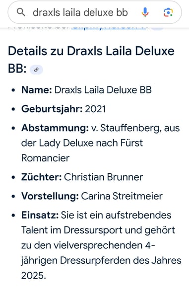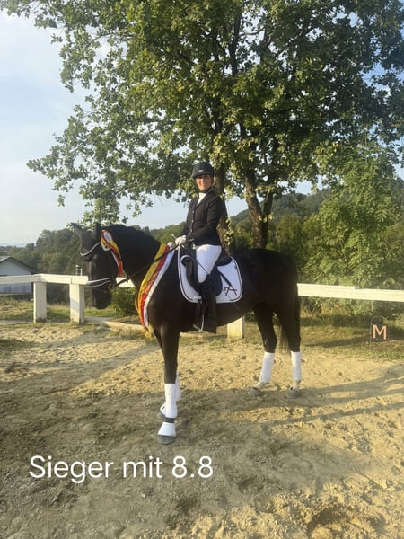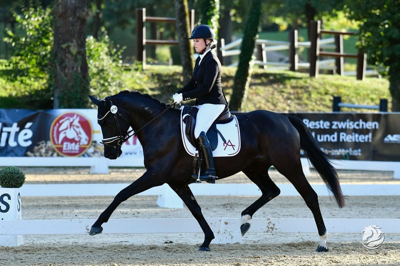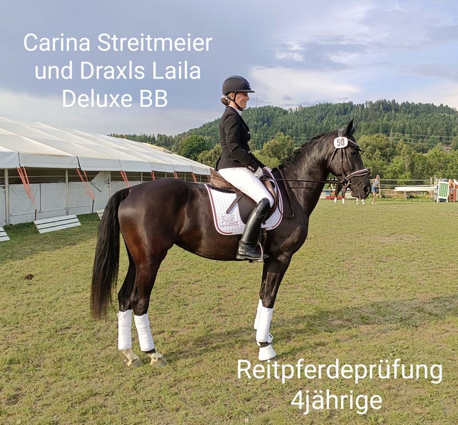 Nervenstarke, leichtrittige 4jährige Stute mit hervorragende GGA Reitpferdeprüfung 3 J. Res.Sieger mit 8.6 Reitpferdeprüfung 4 J. Siegerin mit 8.8 (Schritt 9,5 Galopp 9,0 Trapp 9,0) Bundeschampionat 4 J. 9te von 27 mit 8.0 4x DPA angetreten: 3x gewonnen und 1x 5ter Siegerin einer Prüfung beim AWÖ Dressur Youngster Cup in Oisnitz und Gesamtwertung 10te der 4-6jahrigen