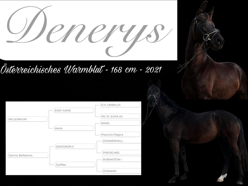Zum Verkauf steht eine schicke, großrahmige Rappstute, Tochter des bewährten Elitehengst Millennium und der Staatsprämienstute Donna Bellissima. Die Stute überzeugt durch ihre Qualität, Ausstrahlung und ihre drei guten Grundgangarten. Diese konnte sie bereits erfolgreich unter Beweis stellen und sich in Dressurpferdeprüfungen der Klasse A platzieren und auch in dieser Klasse gewinnen. Die Stute wurde direkt beim Züchter schonend und altersgerecht angeritten und befindet sich aktuell in Beritt, wo sie für die Dressurpferde Klasse L vorbereitet wird. Sie kennt auch kleine Sprünge, am Platz und im Gelände. Ebenso hat die Stute im Jahr 2025 die Stutleistungsprüfung mit einer Gesamtwertnote von 7,68 abgelegt und hat bei der Reitpferdeprüfung für 4-jährige mit einer Wertnote von 8,0 den 5. Platz belegt. Top Gesundheitszustand mit aktuellem TÜV. Bisher immer Barhuf. Ist im Herdenverband aufgewachsen, kennt Offenstall und Boxenhaltung. Regelmäßig geimpft und entwurmt.