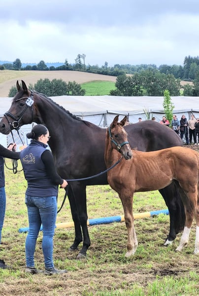 Wanda Born: 2019 Pedigree: Fürst Romancier x Likoto xx Color: Black-brown Height: approx. 176 cm Wanda is a super stylish, large-framed mare with a lot of expression and a very friendly, people-oriented nature. I bought Wanda directly from the breeder at the age of 1.5 years. She grew up in my open stable and is also familiar with box stalls and paddocks. Wanda was started under saddle in 2023/2024 and showed to be light in the hand and comfortable to sit on. Currently, she has a Vitalis foal at foot until the end of October 2025 – the birth was uncomplicated, and Wanda is a great mother mare who is always happy to show her foal. Her offspring already impress with a lot of type and quality. The Vitalis foal is already sold. For May 2026, she is in foal to Vivamor (Viva Gold x Sir Donnerhall) – a promising pairing for sport and breeding. https://damildressage.com/stallions/C2JSsDbh6hUrCErvKWfS I wish for this wonderful mare a first-class place where her valuable lineage is appreciated and promoted. X-ray images from the purchase are available. The mare can be viewed at any time. Location: OÖ District Rohrbach 0043 6608456422