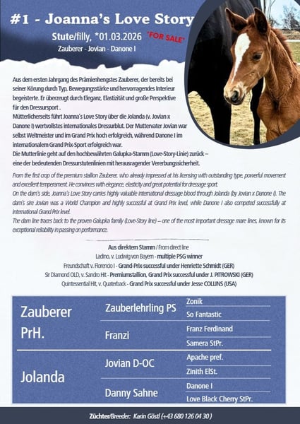 Joanna´s Love Story, Stamm der Galupka (Love Story Stamm) Zum Verkauf steht ein elegantes, langbeiniges und vielversprechendes AWÖ Stutfohlen, geboren Anfang März 2026. Sie beeindruckt nicht nur durch ihr modernes Äußeres und korrektem Fundament, sondern auch durch ihr großes Potenzial im Dressursport. Sie präsentiert sich mit viel Ausdruck und überragenden Grundgangarten mit viel Antritt, der Motor sitzt wo er hingehört. Sie ist bestens für ambitionierte Reiter geeignet, die eine talentierte Nachwuchsstute suchen. Diese junge Dame zeigt bereits überdurchschnittliche Bewegungen und hat das Potenzial für den großen Sport. Schon seit ihrer Geburt ist sie total zutraulich und neugierig. - aktuelles Video kann gerne zusätzlich gesendet werden. Auch die Mutter Jolanda ist eine total zugewandte, verschmuste und menschenbezogene Stute. Geschätztes Endmaß +- 1,71m Bei der Abgabe im Herbst 2026 kennt sie das Fohlen ABC, stand schon mehrmals am Hänger, kennt große Maschinen, Kinder, Rinder, Hunde usw. Unsere Pferde kennen verschiedene Haltungsformen und die Fohlen wachsen artgerecht in der Gruppe mit Gleichaltrigen auf. Wir freuen uns darauf, diesen besonderen Nachwuchs aus unserer privaten kleinen Eigenzucht persönlich vorzustellen. Aus dem ersten Fohlenjahrgang des Hengstes Zauberer (Prämienhengst). Er verzaubert mit unvergleichlicher Ausstrahlung. Ein kompakter, sportlicher und wunderschön aufgemachter Junghengst (2022) mit nahezu idealem Exterieur, bestem Tüv und korrektem, stabilem Fundament. Bei seinen Auftritten beeindruckt er mit Eleganz, Leichtfüßigkeit und Bewegungsstärke, dies bei Gelassenheit und stets kraftvoll abfussend. Hervorzuheben ist sein raumgreifender Schritt. Auch unter dem Sattel kann er seine Stärken immer mehr umsetzen. An der Körung kommentierte Körkomissarin Heike Kemmer: „Mit diesem tollen Interieur wird er es seinem Reiter einmal leicht machen“.Der Vater Zauberlehrling PS, trägt das Erbe des hocherfolgreichen Grand Prix Pferdes Glock´s Zonik, der als Weltcupfinalist, Teilnehmer der Weltreiterspiele in Tyron, sowie den Europameisterschaften zudem 17 gekörte Söhne stellte. In 3. Generation folgt das Blut des Olympiahengstes Blue Hors Zack, welcher mit 42 gekörten Söhnen und 37 Grand Prix erfolgreichen Nachkommen an 5. Stelle des WBFSH Rankings steht. Die Mutter von Franz Ferdinand, Woodlander Dornröschen, war erfolgreich im internationalen Grand Prix Sport unterwegs. Zuchterfolgreich und sportlich abgesichert ist der Stutenstamm der Nikaza: Gekörte Hengste wie der Prämienhengst Friedrich der Große von For Romance II, Deparon von Deveraux und Val Rouge von Valverde entstammen dieser Mutterlinie. Erfolgreiche Grand Prix Pferde aus dem Stamm sind Hot Date von Hotlin, Farrell von Fabregas und Golden Choice DC von Grand Cru.Der viel zu früh verstorbene (Muttervater) Prämienhengst Jovian weißt Debütsiege in der Grand Prix-Klasse und Ergebnissen von über 80 Prozent vor. Ein paar seiner Erfolge:Er gewann 2023 mit Andreas Helgstrand EM-Teamgold, war Zweifacher EM-Teambronzegewinner, erzielte den vierten Platz in der Weltcup-Kür in Vilhelmsborg. 2018 gewann er mit 9,01 seinen Sporttest in Verden. Als Weltmeister der 5-Jährigen ausgezeichnet (mit vier von fünf möglichen 10er-Wertungen) und als Weltmeister der 7-Jährigen mit 95,2% Der viel zu früh verstorbene Vater Apache wurde 2015 in den niederländischen Olympia- Kader berufen. 2018 gehörte er bei den Weltreiterspielen zu der an fünfter Stelle platzierten niederländischen Equipe. Im Jahr darauf wurde er Achter im Weltcup-Finale. Danone I - Der Siegerhengst der schwedischen Körung 2003 ist ein kapitaler Bewegungskönig. Bildschön, mit optimal bergauf formierter Halsung, ideal in der Oberlinie, langbeinig und korrekt im Fundament. Er selbst konnte Platzierungen bis Int. FEI GP4* vorweisen. Aus dem hochbewährten Love Story Stamm kommen Siegerstuten, gekörte Hengste und Grand Prix Pferde u.a. die gekörten und in S-Dressuren erfolgreichen Sir Diamond OLD sowie Fürst Wilhelm. Weitere Hengste wären Rubin Extra (v. Rubinstein), Jazzmate (v. Jazz), Decamerone (v. Diamond Hit), Fürst Love (v. Fürst Heinrich), Franklin's Love PS (v. Franklin), Blue Hors Zee Me Blue (v. Zack) uvm.