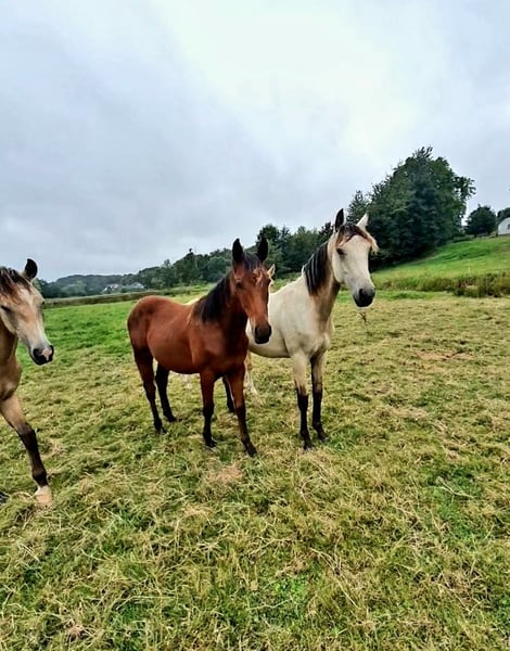 Jeune étalon Azteca avec potentiel cherche des mains affectueuses Je vends de tout cœur mon prometteur étalon Azteca de un an, de couleur marron. Ce joli jeune est un mélange réussi de PRE et de Quarter Horse, ce qui lui confère non seulement un bel aspect, mais aussi beaucoup de potentiel pour l'avenir. Ses bonnes mouvements étendus soulignent sa qualité. Il grandit chez nous dans le respect de son espèce et est parfaitement minéralisé. Nous le voyons comme un partenaire talentueux pour des cavaliers ambitieux en équitation de travail ou dans le domaine du loisir supérieur. Pepe est un petit cheval qui conquiert rapidement le cœur avec sa curiosité et son charme. Si tu es à la recherche d'un jeune cheval particulier qui souhaite être encouragé avec amour et savoir-faire, n'hésite pas à me contacter.