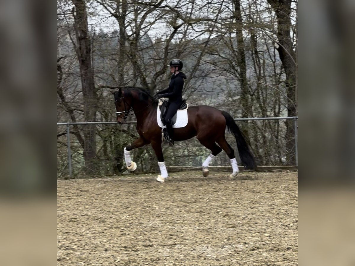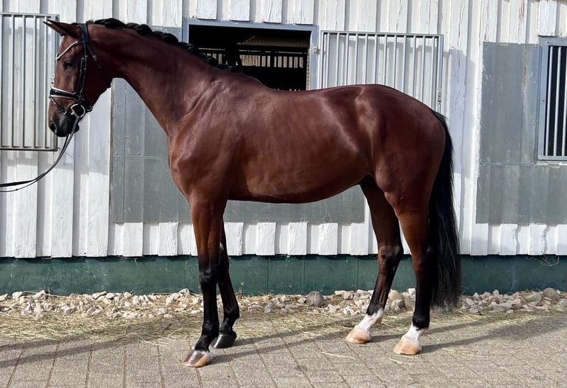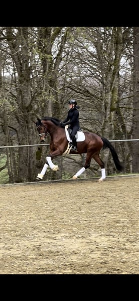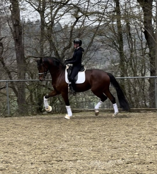 This handsome 5-year-old gelding is homebred and has been gently backed with plenty of time and patience, progressing steadily. He is very well-behaved and affectionate in handling. A true eye-catcher with lots of charm and presence. He possesses incredible talent for more advanced work and impresses especially with his beautiful uphill canter. He is very comfortable to sit and easy to handle. Due to his age and training level, he is only suitable for riders with experience in young horses. A recent veterinary check-up is available.