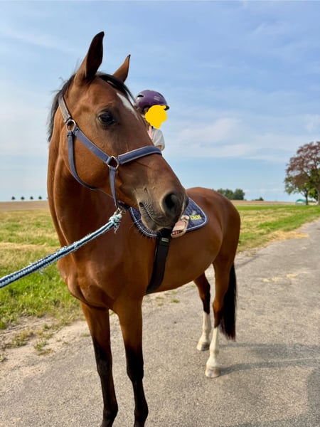 I am offering an 8-year-old mare – a strong-charactered, spirited, and very people-oriented mare who is reliable and friendly in daily handling. She is social in a herd environment, curious, and sensitive to her person. In the field, she is well-behaved and secure, whether alone or in a group. She reacts calmly to traffic. She also impresses in jumping with caution and overview. She is kept barefoot and manages this very well. Loading is no problem for her – she enters the trailer on her own and travels calmly and relaxed. There is a veterinary report available that significantly reduces her price, but it does not bring any restrictions in use or capacity. She is healthy, willing to perform, and shows no abnormalities in daily life. For her, I wish for a home with plenty of turnout, social contact, and loving care. She belongs in hands that appreciate her temperament and provide her with the necessary movement and attention. Whoever is looking for a versatile, honest, and loyal partner will find a very special horse in her.