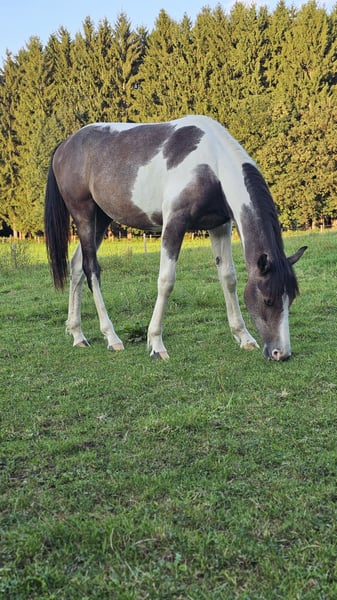 Oshana is a 2-year-old Baroque Pinto mare. She has a valid horse passport and is in good health. She has already been lunged and introduced to basic groundwork. She walks nicely on a lead, is familiar with the farrier, and is regularly trimmed and cleaned. She stands well when being brushed. The only thing is that she can be a bit fussy and whiny when it comes to having her hooves picked out. She is a huge cuddle bug and loves affection, but she is also increasingly enjoying her work. Unfortunately, I need to sell her due to financial reasons. Equipment can be included upon request.