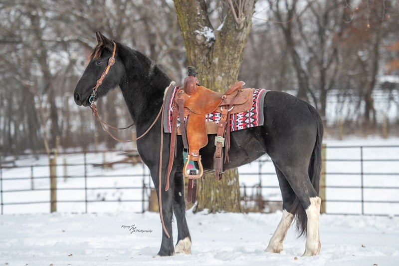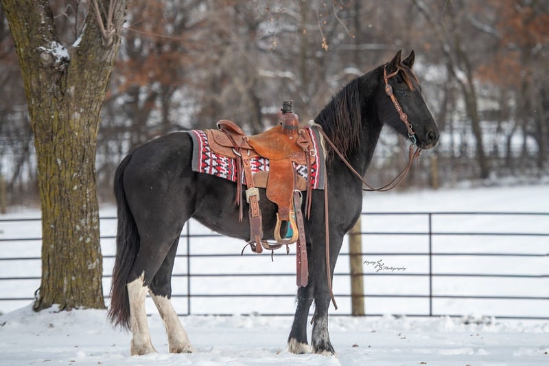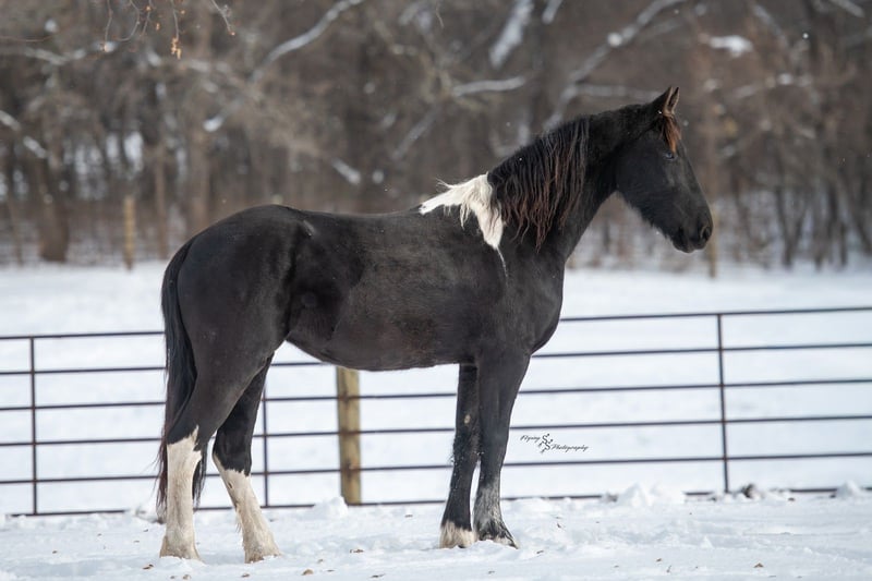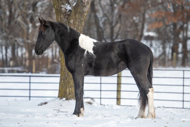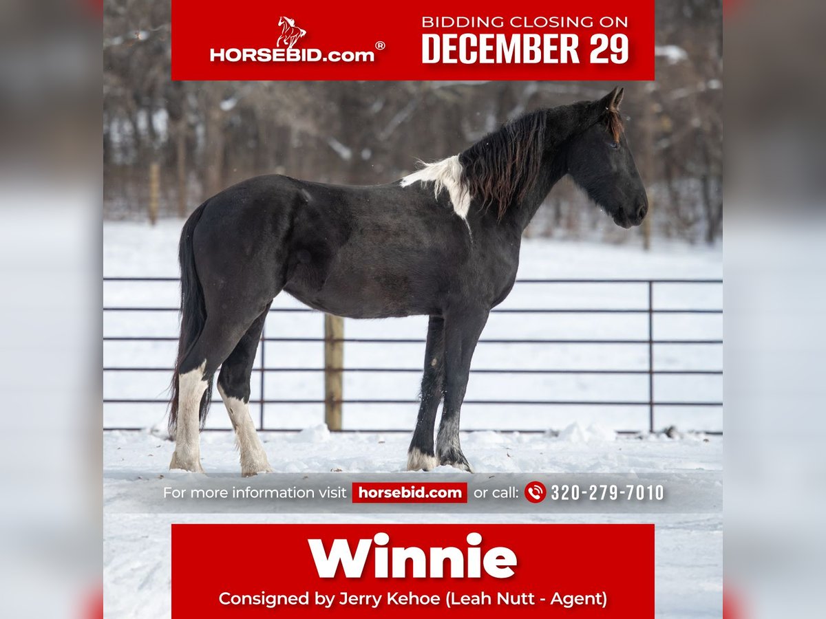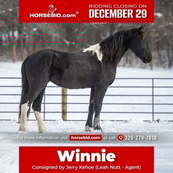 ⚜️𝐓𝐇𝐄 𝓗𝓮𝓻𝓲𝓽𝓪𝓰𝓮 𝐖𝐢𝐧𝐭𝐞𝐫 𝓒𝓵𝓪𝓼𝓼𝓲𝓬⚜️ Happening now thru MONDAY | DECEMBER 29th - Available EXCLUSIVELY on HorseBid's website! For more details and to register visit: www.Horsebid.com CONSIGNOR CONTACT: Jerry Kehoe (Leah Nutt - Agent) Leah: 320-279-7010 LOCATION: Hastings, MN BREED: Baroque Pinto REGISTERED: Yes REGISTERED NAME: Kehoe's Winnie COLOR: Black Tobiano HEIGHT: 14.3 AGE: 2 GENDER: Mare Winnie is a coming 3 year old that has all of the class and style you could ask for. Her breeding is as elegant as she is, 75% Friesian and 25% paint; a BAROQUE PINTO! Registered in the Friesian Heritage Horse and Sporthorse International Registry. Winnie has been started slow and correct, having over 30 days of riding and 6 months of driving. She will walk, trot, and canter both directions with ease. She picks up her leads on cue, and has smooth transitions for her level of training. Winnie collects when asked and moves off of leg pressure as well. She is a free mover that has an absolutely gorgeous extended trot! She stands patiently at a mounting block, rides off quietly, and aims to please with every ride. Winnie has that in your pocket disposition that everyone loves, but she is also very respectful of your space. Winnie is a direct result of our breeding program, and destined for the show pen. We own her mother, and have several of her siblings. She has been with us since birth besides for her time in training. Winnie will excel in an English training program, or make a flashy carriage horse. The opportunities are endless for her! Whether you enjoy the excitement of competing at shows, or want to stroll through central park in a carriage; Winnie has all of the potential to take you there. Winnie is easy to catch, and is the first one to meet you when turned out. She gets along well with other pasture mates. She loads and hauls well, stands for the farrier, and always acts like a lady with no bad habits. Winnie has a very good mind, and has done phenomenal in training. We are proud to offer this sweet mare, and know that you will love her as much as we have. For any additional information, or if you would like to meet Winnie prior to the auction ending, contact Leah (agent) at 320-279-7010.