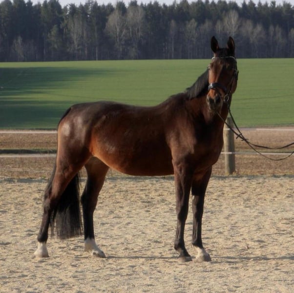 Due to retirement from horsekeeping for age-related reasons, I am offering my nearly 13-year-old mare, Taqueena, for sale. Standing at 17.2 hands, she is a very impressive horse. For the past three years, she has been kept at our farm with a gelding in box stall housing, with daily turnout on pasture or paddock. Prior to that, she was in an open stall with about 30 other horses. She is accustomed to both management styles but probably feels most comfortable with more horses around her. Her previous owner bought her as a foal and trained her. You can find posts from that time under the name Taqueena Royal on Facebook, Instagram, or simply via Google. This Bavarian Warmblood from the Wimmer Breeding Farm has a good pedigree and is in excellent health. We have never needed a veterinarian in the three years we've had her, except for vaccinations. The dentist was also here for a check-up this spring: no issues. She has always been barefoot. She is well-behaved with vets, dentists, and the farrier. Taqueena is very affectionate and people-oriented but requires routine, a calm, consistent handling, and patience. She is eager to learn and enthusiastic about groundwork and dressage. We have lunged her for small children, and two beginner ladies take weekly riding lessons on her—they are completely smitten. She is light to ride and very comfortable in all gaits, even without a saddle. However, she is not a true beginner’s horse, as she sometimes tests her rider. She does not go alone in the terrain. Even with a companion, she can be nervous and tense, especially in built-up areas. In the woods and open terrain, she is calmer and more manageable. She has never had issues in traffic. She needs a confident rider who can give her plenty of security. Please only contact us if genuinely interested. Additional current videos can be sent upon request. Trial riding at the riding arena is possible for serious buyers. This is not an emergency sale. Taqueena can stay with us as long as needed until a new home is found. The price includes all equipment I have for her, such as blankets, grooming tools, and care products. Dressage saddle and bridle (purchased new and fitted for her by the previous owner) can be bought separately for an additional fee.