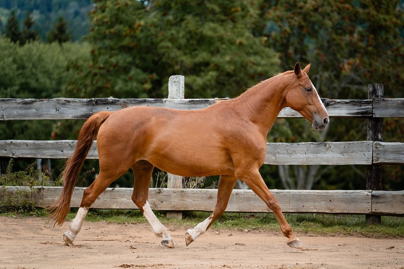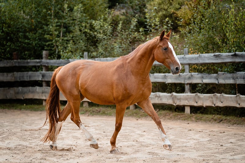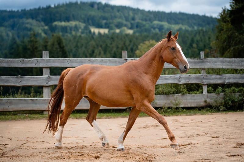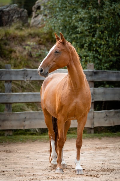 Ruby es una yegua de 20 años de la raza Bavarian Warmblood, con una altura de aproximadamente 1,62 m. Vive con nosotros en un paddock de campo abierto en una manada grande y diversa, y se lleva muy bien con otros caballos. Ruby es muy sensible y se monta con facilidad en bosal (sin bocado), mostrando una actitud colaboradora y motivada tanto en ejercicios de doma en el paddock como en paseos en el campo. Se destaca por ser un caballo de doma sensible y atento. La vendemos debido a una reducción de la cuadra. Debido a que tiene cierta cojera en las patas traseras, la ofrecemos como apta solo para trabajo ocasional o como yegua de cría. Con un buen herraje, es apta para paseos en el campo y en la pista cubierta.