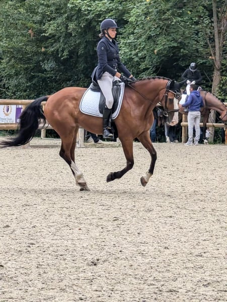 cheval de race SBS super mignon, âgé de 11 ans et toisant 1m60. Débourré à 4 ans , a commencé à travailler puis laissé au pré de 5 à 10 ans, il n’a réellement commencé le travail que l’an dernier. Il est gentil, aime le contact et que l'on s'occupe de lui. Il est très respectueux, aime le travail à pied autant que l’attention qu’on lui accorde au quotidien. Il maitrise bien le travail a pieds et montre une vrai attention dans ce domaine la, apprécie vraiment ce type de travail et est très attentif. Un vrai pot de colle, il adore que l'on s'occuper de lui. Sous la selle, il est particulièrement agréable sur le plat et facile : il maîtrise les trois allures, connaît les principales figures de dressage et montre une vraie écoute de son cavalier. Il est sorti en concours de dressage, s'est bien comporté, très attentif au paddock, un peu impressionné sur les carrés les premières fois puis s'est bien acclimaté. . À l’obstacle, il possède un vrai coup de saut, avec deux parents ayant évolué jusqu’en 135. Il a fait quelques sortis à des épreuves préparatoires 95 cm cette année et a signé un sans-faute. Cependant, c'est un cheval émotif sur les barres et sur la retenue, nécessitera un cavalier calme et sûr de lui pour se projeter dans cette discipline. C'est pour cela que je ne le vend pas à destination de cette discipline principalement ou en connaissance de cause, même s'il se montre plus guerrier en concours, mais il nécessite vraiment un cavalier qui a de l'expérience. En revanche, il adore le cross : volontaire, allant et appliqué, il se fait vraiment plaisir sur un terrain de cross, se montre à l'aise. Part seul ou accompagné à l'extérieur, même s'il a une petite préférence pour partir à plusieurs, il se sent plus à l'aise, même s'il part facilement seul à l'extérieur il peut parfois sursauter ou faire un petit écart, mais n'a jamais eu une once de vices. C’est un cheval particulièrement attachant, motivé et respectueux, idéal pour un cavalier souhaitant évoluer en dressage et se faire plaisir en extérieur ou en cross, tout en continuant de le valoriser. Il peut convenir a une personne avec un niveau intermédiaire pour faire du dressage et évoluer dans cette discipline et sauter un peu en cross, mais conviendra uniquement avec quelqu'un avec un bon niveau pour sauter. Il bénéficie suivi vétérinaire sérieux, est vu par l’ostéopathe plusieurs fois par an, à jour dans ses vaccins, suivi régulièrement par le dentiste, et monte facilement en van. Je le vend uniquement car je ne pourrais plus monter pour quelques temps, et je trouve qu'avec le travail de mise en route qui a été fait cela serait dommage pour lui de se retrouver à l'arrêt alors qu'il démarre à peine son activité. Il vit actuellement en extérieur, est habitué a vivre dehors, il serait malheureux en boxe. Je le vend uniquement à un prix modéré car je souhaite vraiment lui trouver une personne qui saura lui donner l'attention et prendre en compte toute la description que j'en ai faite, sans penser avoir clé en main un grand cheval de sport, mais plutôt un cheval pour se faire plaisir et évoluer au quotidien. Je ne suis pas pressé de le vendre, je souhaite lui trouver la personne adéquate. Plus d’informations et vidéos en message privé.