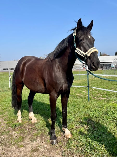 For sale is a stunning Belgian Warmblood gelding, born in 2014. The elegant black stallion impresses with his composure and attractive appearance. Standing approximately 172 cm tall, he has the perfect size. The gelding is a voltigier horse and consistently demonstrates a willing and calm demeanor, even in new situations. He shows clear enjoyment and talent both in free jumping and under saddle, particularly at the jump. His previous owner successfully competed him in show jumping competitions up to 1.20 m. About a year ago, he sustained a fissure on his forearm just above the fetlock after being kicked. This injury has fully healed, and the gelding is now sound, reliable, and fully fit for work without restrictions. He enjoys hacking in a group and is always well-behaved and manageable in the field. He has been trained on both simple and double lunge lines. We are selling him because he does not get along well with the changing riders at our riding school. He is stabled in a box with a paddock and has daily turnout. If you are interested or need more information, please feel free to contact me. A viewing appointment can be arranged at any time.