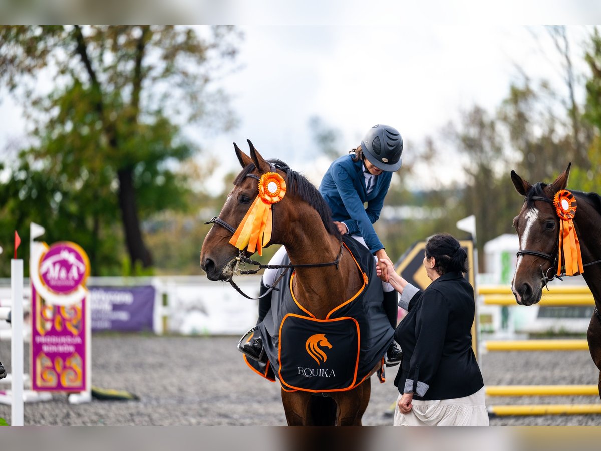 Ideal professor for learning and winning Not afraid of any colors, pool edges, walls, etc. Always on the other side. Has introduced the rider to competitions from 115 to 140 Shoed in front, goes to the lunge daily, and spends all day in the pasture either alone or with one horse.