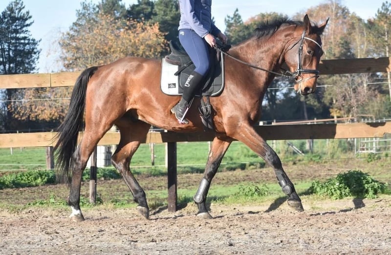 Direct from the breeder, we had the opportunity to acquire him together with his stablemate Valesco van de Melane. Meet Voltaire van de Melane, an impressive and elegant 4.5-year-old gelding approximately 1.75 m tall, with an excellent pedigree: Querido VG x Concorde Z x Tresor D 12. Click HERE for his papers. A horse with a bright future, suitable for both sport (dressage + jumping) and leisure riding. Voltaire is beautifully built and possesses a lot of presence and suppleness. He is a friendly, cheerful, and positive horse. Under saddle, he demonstrates natural balance and a cooperative character. He seeks a good connection with his rider and is a pleasure to ride. He is well-behaved in traffic and trailer loading, both here and previously. Very social. Free of any (stable) faults. Voltaire is in excellent health and moves with great ease, showing plenty of cadence, balance, and scope. He has been radiologically and clinically examined and approved, with no issues in his legs, back, or neck. Recently treated by the dentist and comes with a recent report. €9,750 – including a brand-name saddle and bridle, complete.