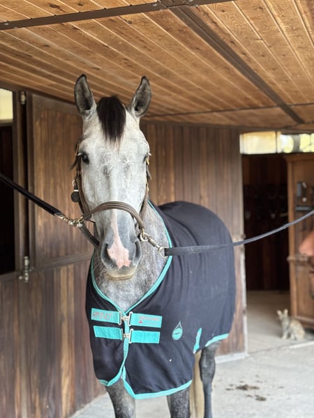 **Französisch:** Notre magnifique licorne est un cheval pour la vie. Du parcours de 1,20 m à la monte sans selle avec les enfants, Ukato fait tout. Il saute actuellement à 1,20 m, mais il montre clairement qu'il a davantage à offrir. Il est calme et ne dit jamais non lors d’un saut, et ses bonnes qualités générales lui permettent de travailler agréablement en dressage. Il connaît des exercices jusqu’à la L et est ainsi un cheval parfait pour toutes les disciplines. Il possède des radiographies et un examen clinique, qui seront fournis sur demande sérieuse.