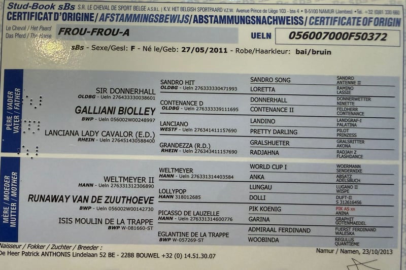 Frou-Frou-A (geb. 05/2011) ist eine Belgische Warmblutstute mit belgischem Pass und abgelegter Stutenleistungsprüfung. Vorab: alle Bilder zeigen den aktuellen Zustand, das letzte 3er-Collagenbild sind recherchierte Bilder von früher. "Frou" verfügt über eine hochkarätige Abstammung mit bekannten Linien wie Weltmeyer, Donnerhall und Sandro Hit (siehe Bild Pass) und bringt interessante Voraussetzungen für Zucht und Sport mit. Frou war laut Recherchen über viele Jahre als Zuchtstute in Belgien und auch in Österreich eingesetzt worden und hat mehrere Fohlen gebracht (laut Recherchen werden ihre Nachkommen erfolgreich in Zucht und Sport eingesetzt). Anschließend kam sie nach Deutschland. Über ihre genaue Vergangenheit ist nicht alles bekannt, jedoch ist sicher, dass sie zuletzt durch unglückliche Umstände in keine optimalen Haltungsbedingungen geraten ist und vom Vorbesitzer da raus "gerettet" wurde. Seit sechs Monaten befindet sie sich im aktuellen Besitz und wurde in dieser Zeit von uns sorgfältig aufgebaut und wieder an die Arbeit herangeführt. Sie ist inzwischen wieder in allen Gangarten reitbar, benötigt jedoch aktuell noch etwas Zeit und gezieltes Training, um mehr Go, Kraft und Ausdauer aufzubauen. Sie wurde erst seit kurzer Zeit wieder reiterlich angeschoben, diese Entwicklung ist also noch im Aufbau und kann bei entsprechendem Training gut weiter gefördert werden. Für Anfänger ist sie nicht geeignet, ein erfahrener Reiter ist Voraussetzung. Frou benötigt ausreichend Zeit, um sich an eine neue Umgebung zu gewöhnen. Sie ist nach einer Eingewöhnungsphase sozial verträglich im Umgang mit anderen Pferden. Aktuell erhält sie tagsüber Weidegang und steht nachts in der Box. Die Boxenhaltung ist grundsätzlich machbar, sie benötigt jedoch eine längere Eingewöhnungszeit, um sich darin wirklich wohlzufühlen. Aus diesem Grund würden wir sie bevorzugt in Offenstall- oder Weidehaltung vermitteln, da sie sich dort wahrscheinlich deutlich schneller und besser zurechtfindet. Der Transport im Hänger bereitet ihr derzeit noch große Schwierigkeiten und sollte mit Ruhe und gezieltem Training durch feste Bezugspersonen weiter geübt werden. Da bei uns regelmäßig Auswärtstraining erforderlich ist und sich dies entsprechend schwierig gestaltet, ist dies – zusammen mit dem vorhandenen Zeitaufwand für ihre weitere Förderung – der Hauptgrund für den Verkauf. Aufgrund ihrer hochkarätigen Abstammung sowie der Tatsache, dass sie regelmäßig rossig wird, ist sie auch für die Zucht weiterhin interessant. Sie wird ohne Equipment verkauft. Frou steht in 06577 (Kyffhäuserkreis). Wir wünschen uns für Frou ein Zuhause mit erfahrenen Pferdemenschem, in dem sie sich wohlfühlen kann und gezielt auf ihre Bedürfnisse eingegangen wird. Bei Interesse gerne melden!