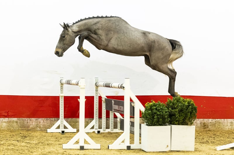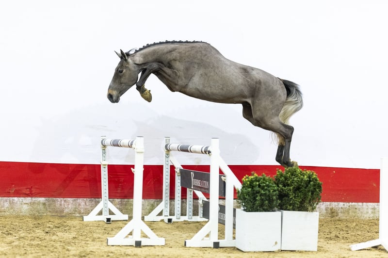 Beautiful dark grey with a modern type. He has a calm character and stays level-headed in his work. He shows a very attractive jumping style with notably strong front-end technique. Jumps well with the withers coming back and finishes the fence good. Just almost two years and already jumping full lines with ease. Shows scope naturally and plenty of commitment. Quick off the ground and consistent in his technique. A quality horse with the mindset for further development.