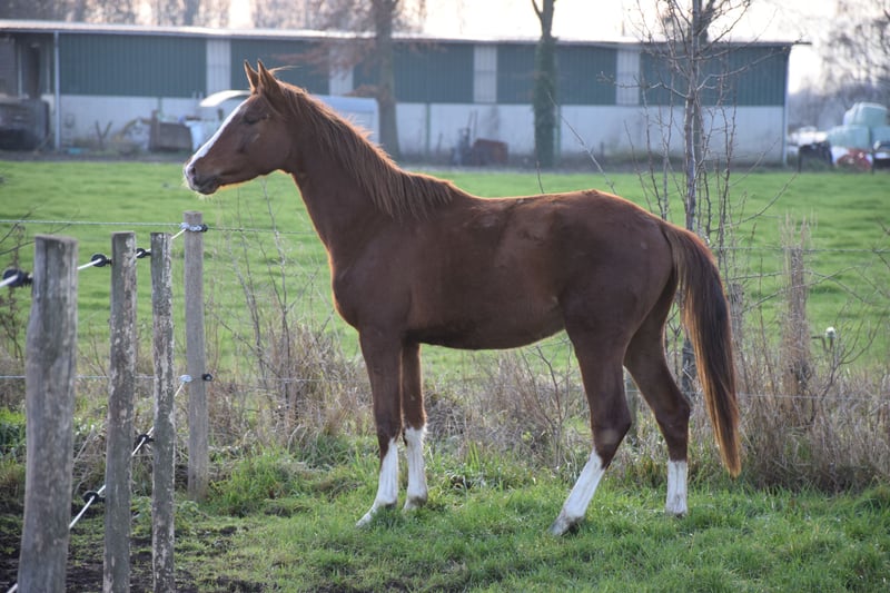 Ariletto Ballante Veelbelovende dressuurhengst – 2023 Te koop: Ariletto Ballante, een opvallende voshengst met vier witte benen, modern gebouwd en met een aansprekend model. Hij is een zoon van Rigoletto Ballante, uit een moederlijn die rechtstreeks teruggaat op de Grand Prix-hengst Painted Black. Verwachte stokmaat ca. 1m70. Ariletto is in kuddeverband opgegroeid, wat resulteert in een uitzonderlijk nuchter en sociaal karakter. Hij is mensgericht, makkelijk in de omgang en toont geen uitgesproken hengstengedrag. Hij laat zich probleemloos hanteren en leiden door verschillende personen, wat hem ook voor ambitieuze amateurs interessant maakt. In de dagelijkse praktijk is hij braaf bij dierenarts en hoefsmid, regelmatig bekapt en ontwormd. Hij is stal- en weidegewend, makkelijk uit de kudde te halen en gewend aan buitenomgeving, verkeer en verschillende geluiden. Daarnaast is hij trailergewenning en laat zich zonder problemen vervoeren. In beweging overtuigt Ariletto met zijn natuurlijke balans en souplesse. Hij beschikt over een ruime, correcte stap, een tactmatige draf met natuurlijke zelfhouding en een opwaartse, gedragen galop die gemakkelijk aan te springen is. Hij beweegt soepel door het lichaam en toont van nature een fijne manier van bewegen, zonder forceren. Ariletto Ballante is een zeer interessante jonge hengst voor wie een toekomstig dressuurpaard wil opleiden vanaf de basis: correct opgegroeid, fijn in karakter en met aantrekkelijke bloedvoering.