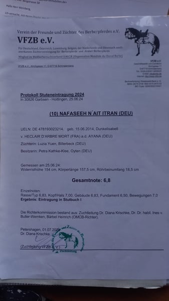 Zum Verkauf steht die reinrassige Berber-Stute NAFASEEH N’AIT ITRAN, geboren 06/2014, Goldfalbe, Stockmaß 154 cm. Eingetragen im Stutbuch I der VFZB mit der Gesamtnote 6,8. Abstammung: Vater: HÉCLAIR D’ARBRE MORT (Perlino) Mutter: AYANA (Schimmel) von JIHAL aus der GHARDAIA DE TRABAT Substanz, trockene Fundamente, Ausdauer und ein klarer, wacher Charakter kennzeichnen Nafaseeh. Sie zeigt sich menschenbezogen, kooperativ und nervenstark, mit feiner Reaktion auf Körpersignale. Aufgrund ihres Typs, ihrer Abstammung und der Eintragung im Stutbuch I eignet sie sich sowohl als gehfreudiges Freizeit- und Geländepferd als auch für Berber-Liebhaber mit Interesse an Rasseerhalt und Zucht. Die Stute lebt in einer kleinen Herde im Offenstall, ist gesund, schmiedefromm, geht auf den Anhänger und zeigt keine Unarten. In der Herde ist sie vorsichtig und geht lieber weg als zu streiten. Sie ist kein Anfängerpferd, überzeugt jedoch durch Ehrlichkeit, Vorwärtsfreude und Geländesicherheit, wach, mutig und ausdauernd. Sie ist eine Partnerin für Menschen mit innerer Ruhe, Klarheit und Respekt vor der Ursprünglichkeit dieser alten Rasse. Diese Stute sucht keinen „Besitzer“, sondern einen Menschen, der ihre Sprache versteht und ihr Raum lässt, sich zu zeigen. Die Abgabe erfolgt ausschließlich wegen Aufgabe der Pferdehaltung. Gesucht wird ein wertschätzender Platz bei Menschen, die die Besonderheit und Ursprünglichkeit des Berber-Pferdes kennen oder kennen lernen wollen. Bei ehrlichem Interesse freue ich mich über ein faires Angebot und ein Kennenlernen auf Augenhöhe.