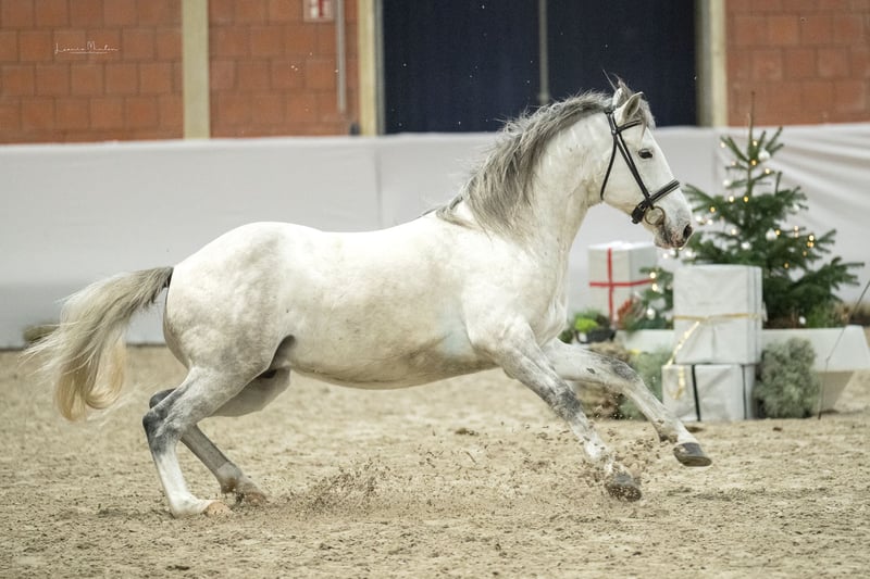... un endroit qui souhaite promouvoir ses installations dans tous les sens. Koh-I-Noor - surnommé Klausi - impressionne par sa maturité physique et mentale. Un véritable Berbère de conte de fées, qui offre dans la réalité autant que ce que son pedigree au-dessus de la moyenne promet. Avec lui, il ne s'agit pas seulement de "Berbère", il offre également tout ce que nous attendons d'un noble représentant de sa race ! Depuis un certain temps, nous souhaitions avoir un fils direct en plus d'une jument de reproduction, petite-fille de JASON de la Fôret, comme un autre successeur dans notre élevage. Une jument rare du beau Hadji nous a semblé particulièrement adaptée - également pour sécuriser la couleur d'Agouti. Koh-i-Noor, surnommé "Klausi Klunker", a en outre confirmé que l'accouplement avec des chevaux gris exceptionnels est TOUJOURS un atout, quelle que soit la couleur du résultat. Son apparence est marquée par la masculinité et l'aura supérieure des excellents étalons de sa lignée. Channur al Najib a également été si généreuse qu'elle a transmis à son fils une touche de couleur supplémentaire du sang de Lancelot de l’arbre Mort. Avec Lohra comme arrière-grand-mère maternelle, une solide ascendance arabe-berbère vient également renforcer sa valeur en tant que candidat étalon pour une transmission stable des caractéristiques et une sécurité dans le fondement. Comme nous maintenons encore plusieurs étalons âgés dans l'élevage, nous recherchons pour Koh un endroit responsable où le travail sous la selle et une autre utilisation pour l'élevage sont possibles !
