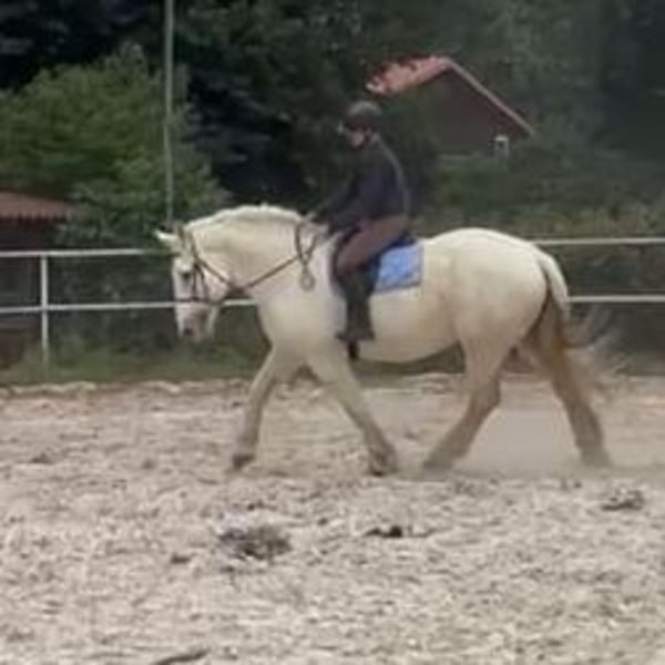 « Jimi » est un cheval de trait français Boulonnais avec une origine allemande (passeport avec diagramme des marques et transpondeur). Son père est le célèbre Boulonnais « Jumper » de Tamme Hanken – connu de tous par la télévision. Né le : 21/06/2016 Taille au garrot : environ 1,79 m Vacciné, vermifugé, entretenu toutes les 6 semaines par le maréchal-ferrant, sans CPL – il n’a ni raspe ni gale de boue, jambes saines. Depuis quelque temps, il est ferré uniquement à l’avant. Ses yeux sont sensibles au vent et ont tendance à couler légèrement. Jimi a été monté (voir photos) : < Dressage en manège < Balade en extérieur < Avec un cheval de tête, il sort aussi en balade dans la nature Jimi a été mis en selle (voir photos) : < En attelage simple et double < En extérieur / circulation routière Jimi connaît et apprécie également : < Le travail à pied < Le travail en rond de longe < Le longeage : pas, trot, galop et arrêt parfaits à la longe < La longe en liberté (marcher avec le cheval) < La mise en van : il reste très calme et détendu dans le van < La ferrure < La vie en box, en paddock 24/7, ainsi qu’en stabulation libre En raison de sa taille, Jimi n’est pas un cheval pour débutants. Il est volontaire et cherche à bien faire, une fois qu’il a gagné la confiance de son cavalier. Ce n’est pas un cheval ennuyeux. Nous avons décidé de vendre ce joli cheval car je dois reconnaître que, pour bien le gérer, je suis simplement trop petite (1,60 m / 45 kg). Je souhaite donc lui trouver une personne qui pourra mieux répondre à ses besoins. Pour toute question, n’hésitez pas à me contacter : 0163 963 84 90