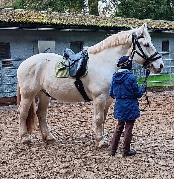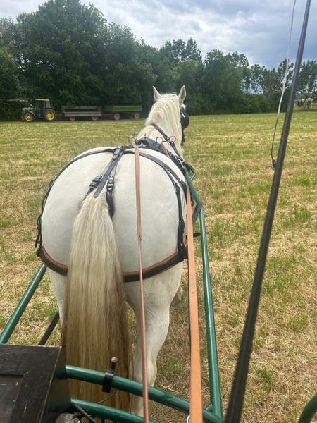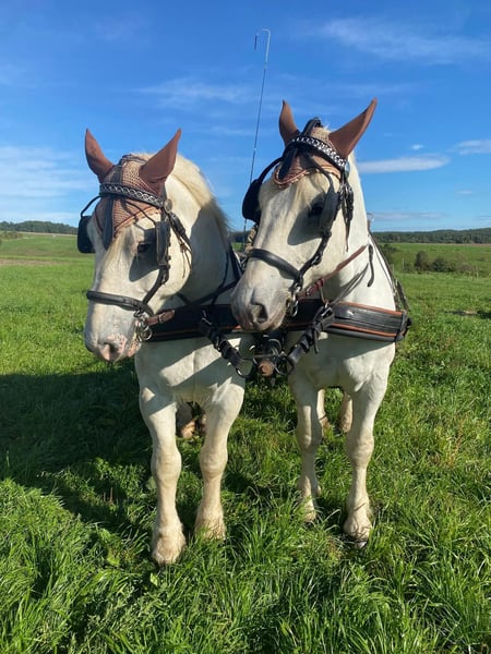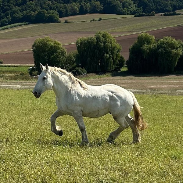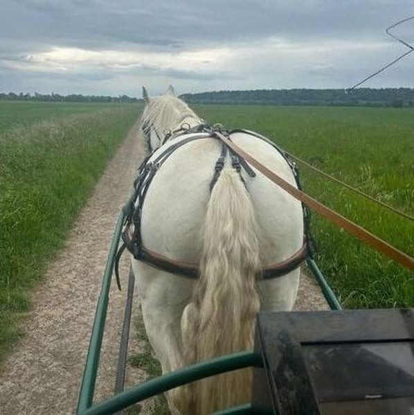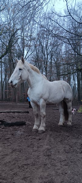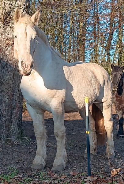 Jimi is a French Boulonnais draft horse with German pedigree documentation (horse passport with breed markings and transponder). His sire is the well-known Boulonnais stallion "Jumper" by Tamme Hanken – familiar to many from television. Born: June 21, 2016 Height: approximately 17.9 hh Vaccinated, dewormed, hoof care every six weeks, no CPL – he has no scratches or mud fever, and his legs are healthy. He has been barefoot for some time now. His eyes are sensitive to wind and tend to water slightly. Jimi has been ridden (see photos): < Dressage work in the riding arena < Trail riding < He also rides out in the field with a lead pony He is broken-in (see photos): < Driven single and pair < Out in the terrain and on the road Jimi also enjoys and is familiar with: < Groundwork < Round pen work < Lunging: walk, trot, canter, and halt are perfect on the lunge line < Desensitization exercises (leading with the horse) < Trailer loading: he stands very calmly and relaxed < Farrier work < Stable and pasture turnout 24/7, as well as open stall management Due to his size, Jimi is not suitable for beginner riders. He is eager to learn and strives to do everything correctly once he has gained trust. He is not a boring horse. We have decided to sell this lovely horse because I have to admit that I am simply too small (1.60 m / 45 kg) for the proper handling and riding of him. Therefore, I am looking for a more suitable owner who can form a better bond with him. If interested, please contact us: 0163 963 84 90