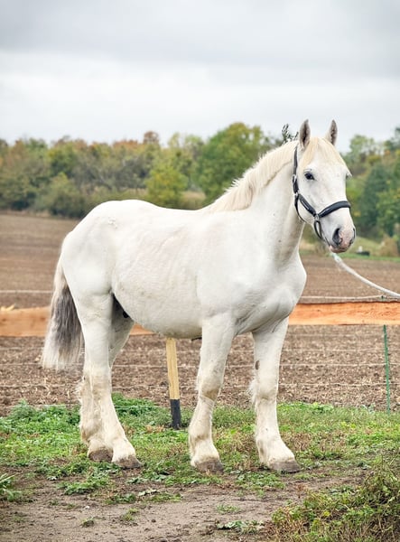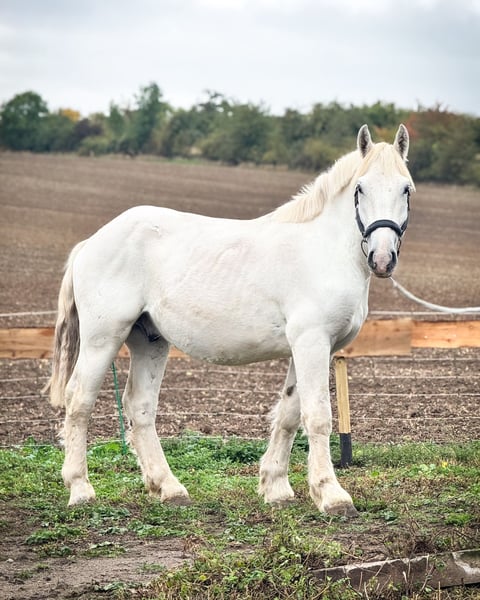 For sale is a 2-year-old Boulonnais gelding with full papers. He impresses with his correct conformation, honest character, and positive attitude towards humans. The gelding is very trusting, open-minded, and eager to learn. He is halter-trained, willingly gives all four hooves, and is always reliable and calm in daily handling. With a current height of about 1.60 m, he is expected to grow a bit more. A great young partner – ideal for future use under saddle or in front of the cart.