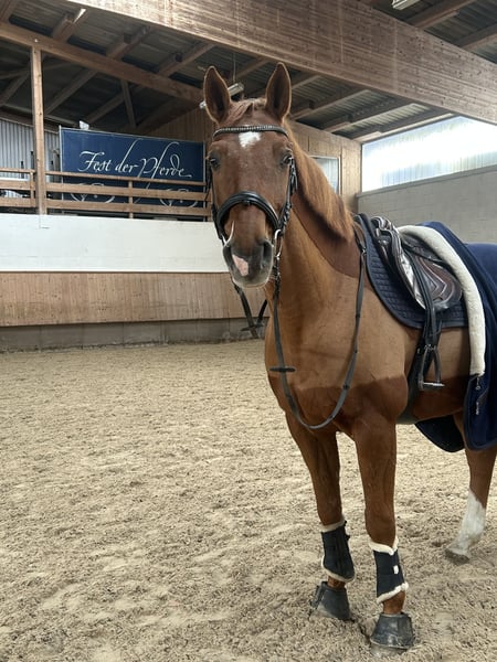 Zum Verkauf steht ein eleganter Brandenburger Warmblut-Wallach, geboren im Jahr 2015. Derzeit ist er mit 14 Jährigen Tochter E-Plaziert. Bei unserem Vorgänger war er im Springen L-Plaziert. Ein Parkour gibt er immer 120 % und es bemüht, keine Fehler zu machen. Er hat ein angenehmes Go beim Springen, was auch ideal für Anfänger ist. Unser charmante Fuchs überzeugt durch sein ausgeglichenes Wesen und seine Vielseitigkeit im Springsport als auch in der Dressur. Er beherrscht alle Lektionen der Klasse L und fliegende Wechsel ebenfalls. . Dank seiner soliden Grundausbildung ist er sowohl für ambitionierte Freizeitreiter als auch für turnierorientierte Reiter bestens geeignet. Im Gelände ist er ein absolutes Verlass Pferd, sowohl alleine als auch mit anderen Pferden. Er geht brav in den Henger und ist mit zwei Eisen beschlagen. Im E & A Springen ist er ein Schleifengarant (1a Rimondo-Biografie) Mit seinem kraftvollen Sprungvermögen und seiner guten Einstellung zum Springen zeigt er sich stets motiviert und zuverlässig im Parcours. Ein zuverlässiger Partner, der durch sein angenehmes Temperament und seine gute Rittigkeit begeistert. Ideal für Reiter, die einen erfahrenen, gut gerittenen Springpferd suchen. Er ist ein idealer Lehrmeister für unsere Tochter gewesen, leider müssen wir uns aus gesundheitlichen Gründen von ihm trennen. Wir wünschen uns für ihn ein schönes Zuhause, weshalb Platz vor Preis gilt ! Bei Fragen und Interesse schreiben Sie uns gern eine WhatsApp oder rufen uns unter 0177 8798913 an.