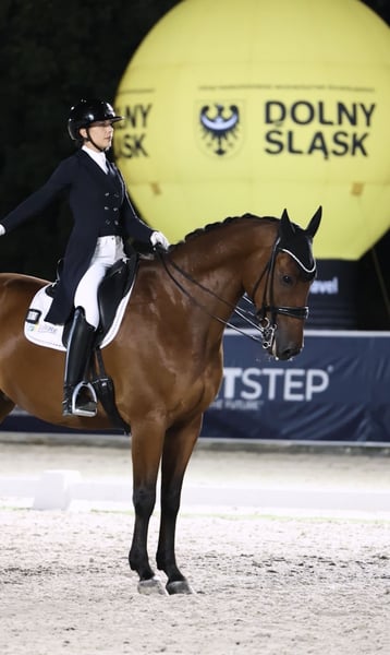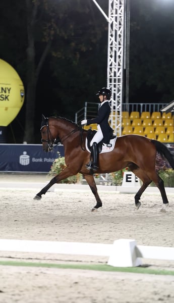Carácter y talento excepcionales, un caballo FEI que sería ideal para un jinete junior, joven o amateur que busca un caballo talentoso para lograr éxitos en la disciplina de doma clásica. Recientemente obtuvo un 66 % y quedó en 5ª posición en el CDI de Ornago, está listo para la arena de competición. Disfruta de paseos en el campo, funciona perfectamente en concursos tanto en pista cubierta como al aire libre, y es muy fácil y dulce de tener en el establo. Es progresivo, por lo que sería adecuado para un jinete seguro de sí mismo que quiera triunfar. Buena revisión veterinaria.