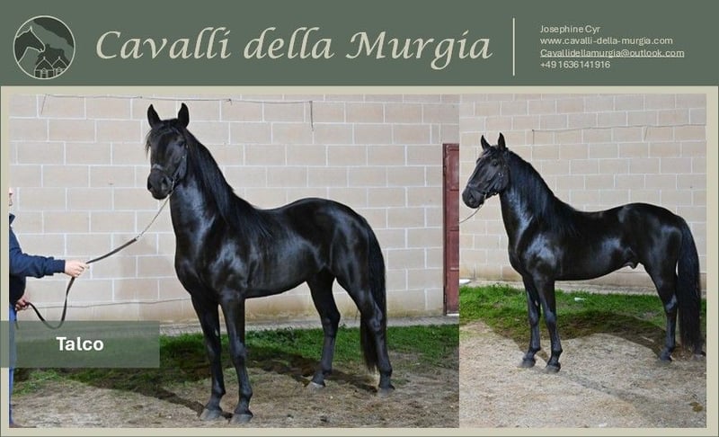 Talco, geboren in 2023, staat momenteel bij zijn fokker in Apulië, Italië, waar hij opgroeit in een optimale omgeving. Hij overtuigt door zijn elegante uitstraling en zijn fijne karakter, waardoor hij een ideale partner is voor ruiters die waarde hechten aan harmonie en een vertrouwensvolle samenwerking. Talco is zeer mensgericht en beschikt over uitstekende eigenschappen voor een veelzijdige toekomst. Hij is vooral geschikt voor disciplines zoals Barokrijden, Working Equitation of als betrouwbare vrijetijdsgenoot. Talco is de perfecte keuze voor liefhebbers van jonge paarden die op zoek zijn naar een partner met veel hart en karakter. Heeft u interesse in Talco en wilt u hem graag persoonlijk ontmoeten? Wij helpen u graag bij het plannen van een bezoek aan zijn woonplaats. Talco wordt via Cavalli della Murgia aangeboden. Röntgenfoto’s, aanvullende foto’s en video’s sturen wij graag op aanvraag. De volledige aankoopafhandeling, inclusief keuring en transport naar Duitsland, wordt eveneens door ons geregeld. Heeft u nog vragen? Stuur ons gerust een e-mail – cavallidellamurgia@outlook.com. Wij kijken uit naar uw bericht.