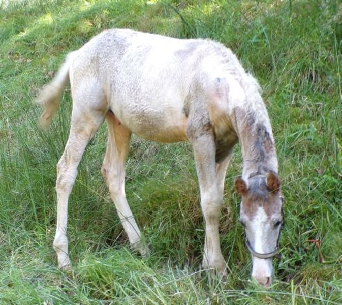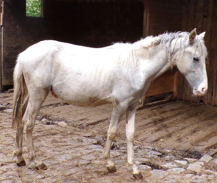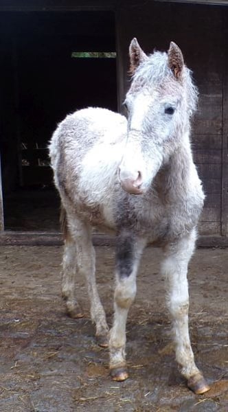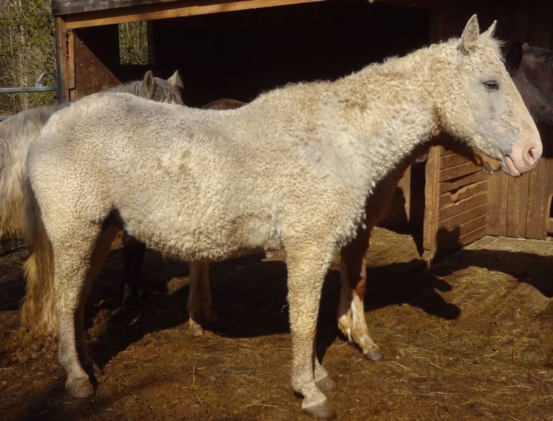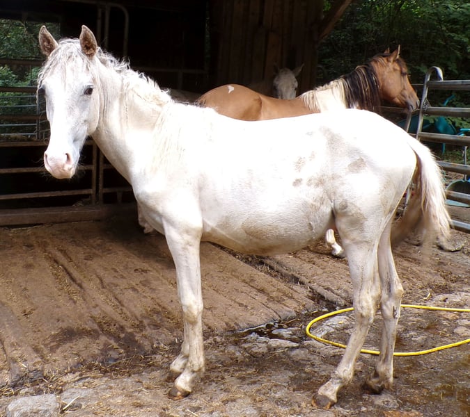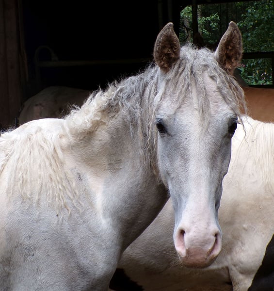 Leonardo is a nice, still somewhat shy young stallion with Pinto papers from the ZfdP, as Paso Fino is not allowed with the Curlys. His father is a Paso Fino, from whom he also inherited the tölt, and his mother is a pure Curly Horse. ICHO papers can be applied for. He will be gray; as a foal, he was a chestnut pinto.