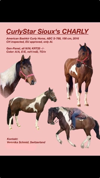 CHARLY ist ein sehr ausgeglichenes und menschenbezogenes Curly Horse. Bei der Körung und Hengstleistungsprüfung in der Schweiz war CHARLY Tages-Sieger = „Best in Show“. Er verfügt über ein sehr korrektes Fundament schöne Gänge und hat einen 1A-Charakter! CHARLY vererbt reinerbig schwarz, er produziert keine Füchse. Selbstverständlich ist er auf Genkrankheiten getestet, alle mit negativem Resultat! Er ist registriert beim ABC, ICHO und SVPK. Es ist nur Tiefgefriersamen erhältlich, da CHARLY inzwischen Wallach ist.
