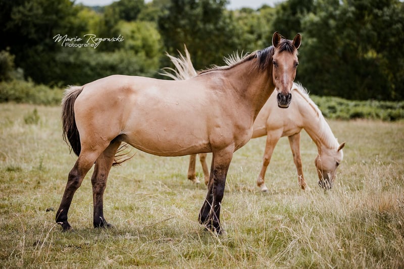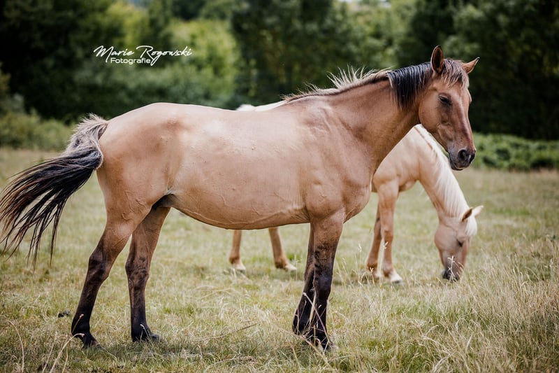 FUNNY GIRL is currently the only broodmare worldwide with a full warmblood pedigree in brown coat colour with DUN lightening, which did not come from Western horse breeds or Spanish blood, but can be traced back to proven mating in Germany in 1985 and has been carefully bred. At the renowned Trakehner stud farm in Merzdorf, the licensed Norwegian Fjord horse stallion Emil *1972 covered the English thoroughbred mare Feinsliebchen, who was registered in the main stud book of German Trakehner breeding. The Trakehner Association and later the ZfDP recognised this and the filly qualified for the main stud book. This is Funny Girl's grandmother. The DUN gene continues to be passed on very successfully through the dam line to this day. The stud book extracts were renewed in 2024 by the participating breeding associations in Germany. The mare came to us as a two-year-old filly via an auction in 2011. Since then, she has lived in the large broodmare herd, and since 2020 in France. To date, she has had six healthy foals, both through natural mating and insemination. In 2014, the palomino colt PALADIN GOLD GF (ZfDP), who lives in England. In 2015, the filly FABULA GF (AES), the first DUNALINO mare born worldwide with full papers, now herself a broodmare in our herd. Both are by the world's first thoroughbred in smokey-cream TCF PALLADIUM xx (CAN), who is stationed with us. In 2016, the black colt ROCHER NOIR GF by Rodrigoo VDL – proven Holstein show jumping lines. In 2018, the bay DUN colt FABELKÖNIG FALKENHORST Z by Fürst Wilhelm. This incredible Zangersheide-branded stallion has now been approved. 2020: the black filly MIDNIGHT Z by Mykonos (Millenium). 2022: the bay DUN filly LADY IN DUN Z by our frame-overo thoroughbred Letter of Marque xx (USA). She is always an exemplary mother and a confident member of the herd, unobtrusive in her manner. Due to the dissolution of the herd, this unique mare, which qualifies this colour variation for international sport horse breeding, is being sold. Recognition as explained above: ZfDP, AES, Zangersheide. Additionally, 2022 IFCE France entry broodmare (Stud-book de reproduction: FACTEUR DE SELLE FRANCAIS). DNA card available. Colour gene test AA.