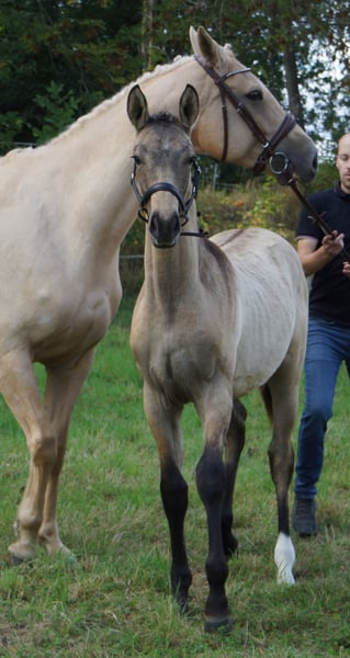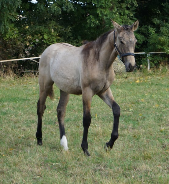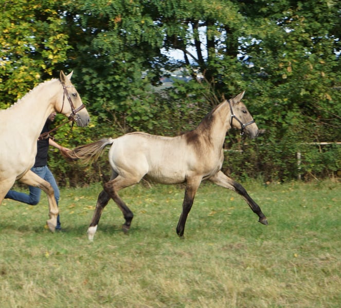 This powerful mare not only impresses with her calm and people-oriented character but also with her genetics. She carries two dilution genes, namely the cream gene and the dun gene, making her a true buckskin with a dorsal stripe on her back and zebra stripes on her legs (known as Dunskin, which combines buckskin and palomino). Additionally, she boasts a flawless and extremely correct conformation, standing on strong, healthy legs. She owes this to her parents, as her father is none other than the Lusitano stallion Inefavel, who competes at Grand Prix level. He has recently been recognized by the Oldenburg Verband and captivates not only with his unique appearance but also brings the necessary toughness and robustness that have become less prominent in modern sport horse breeding, all while maintaining excellent movement potential. His offspring are known for their quality and charisma, so it is no surprise that this little ballerina received an above-average rating from the association and can be called a premium foal. On the maternal side, a clear-headed versatile Czech line meets the highly sought-after blood of the influential stallion Quarterback. The resulting dam of this little mover teaches her foal how relaxed interactions with the environment and people can be, making the learning period for the basics a breeze. She is familiar with everything one needs to know, meaning leading, grooming, tying, and picking up hooves are no problem. Since we only raise two large foals a year, she has also experienced plenty of family connection in her young life. Her birth and upbringing have been absolutely complication-free, and she has had the opportunity to grow up with plenty of movement on various surfaces. Specifically, she spent the first three days with her mother in a 4x6m outdoor box and then enjoyed 24-hour access to the paddock with another mare and her foal. This also means that, despite having shelter, she has experienced all kinds of weather. Trade or part-exchange for a pregnant broodmare (black or special color) is possible.
