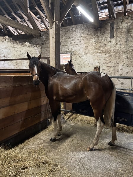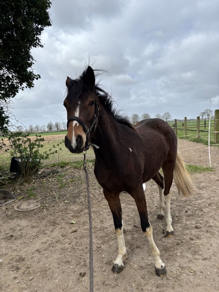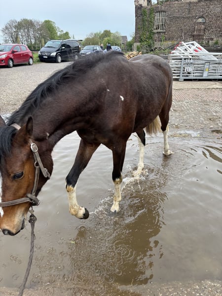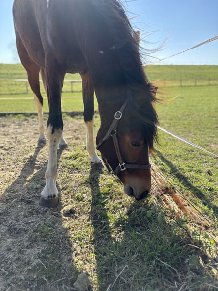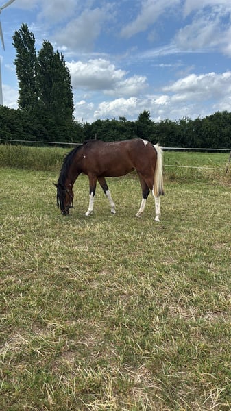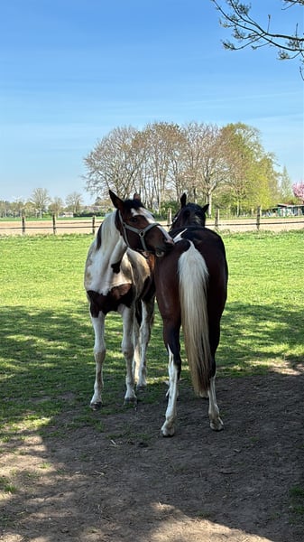 Here I am offering my beautiful two-year-old pinto mare, currently standing at 1.52 meters, for sale. I purchased her a year ago together with her half-sister so they could grow up together. Honestly, I couldn't decide at the time and simply wanted to keep them together. Now I have come to the decision to keep her sister, as the chemistry between us simply feels better. Ariel is completely fearless and has already experienced many things. She is familiar with tractors, children, and even walks through water. She has already mastered trailer loading wonderfully and goes on without any issues. Since she was a foal, she has been accustomed to humans; she lunges without problems and is used to working in the arena. Initial longeing attempts are also successful. If you're looking for a real eye-catcher to train yourself, this versatile mare is just the right choice. Her sire is the wealthy pony stallion Jacky Boy. On her dam's side, her pedigree includes Gribaldi and Florestan. Please feel free to contact me if you have any questions.