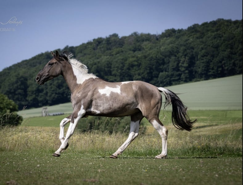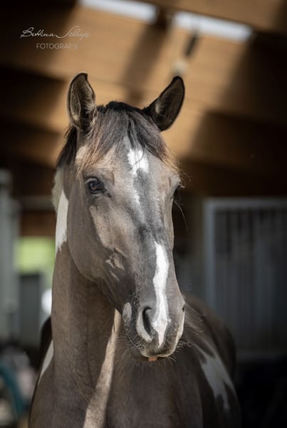 Rare value in Warmblood breeding! Inherits the Cream gene, the Tobiano gene, and the Grullo gene! This extremely charming mare is looking for a 5-star home where she will be appreciated and trained in a horse-friendly manner! Currently still on summer pasture, the mare can be backed in the autumn. From a very fertile dam line. Sire is currently registered in HB 1, successful in dressage up to S level and in eventing A. Dam's sire Samico F, the most successful dressage pinto!