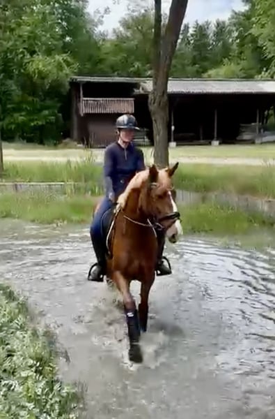 Amicelli is an absolute gem, not only because of her striking color but also due to her rideability and willingness to learn. She has three good basic gaits, with her trot being particularly impressive. This year, she has competed in her first two competitions, and at her second outing, she achieved a score of 7.4, which placed her directly in fourth position. In training, we have started working on lateral movements. Amicelli is extremely comfortable to ride and very child-friendly, making her an ideal family horse. If interested, please contact me exclusively by phone at 0170-2767100 or via WhatsApp. A video can be sent upon request.