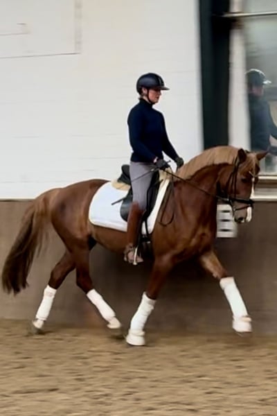 Amicelli is an absolute gem, not only because of her striking color but also due to her rideability and willingness to learn. She has three good basic gaits, with her trot being particularly impressive. This year, she has competed in her first two competitions, and at her second outing, she achieved a score of 7.4, which placed her directly in fourth position. In training, we have started working on lateral movements. Amicelli is extremely comfortable to ride and very child-friendly, making her an ideal family horse. If interested, please contact me exclusively by phone at 0170-2767100 or via WhatsApp. A video can be sent upon request.
