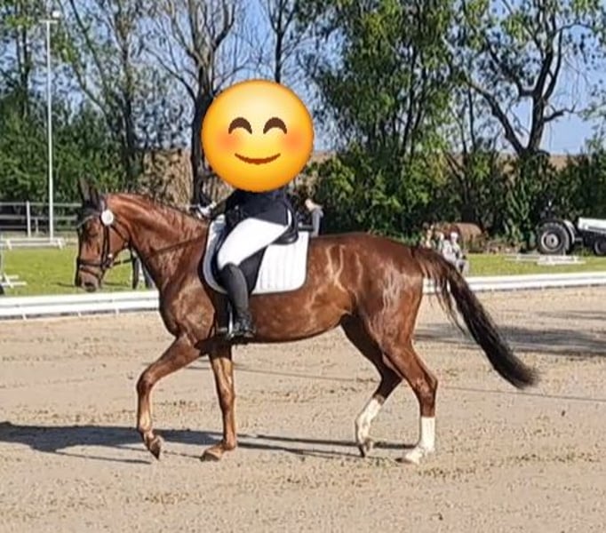 For sale is a 6-year-old mare (height at 16.1 hh) who impresses with her friendly and uncomplicated nature in daily handling. She is very personable, well-behaved during handling, and confident in loading. She also handles being alone for short periods, such as while grazing, without any issues. By Don Royal (sire) out of a Quarterback (dam), she carries excellent dressage-oriented genetics. She is registered in the stud book and has received consistently good evaluations, with scores of 7.5 to 8 in movement and conformation. Training-wise, she is at a solid L-level and has already been successfully presented in dressage horse tests at class L competitions. Under saddle, she is motivated, eager to perform, and shows great potential for further development. However, she should be ridden by an experienced rider, as she can sometimes react sensitively and respond quickly. She is always honest and does not buck, but she requires a confident and calm rider. Currently, she is not suitable as a children's riding horse and has not been fully tested in traffic, as she can be startled by fast-moving cars. An excellent mare for an ambitious rider seeking a talented young horse with good pedigree and promising prospects.