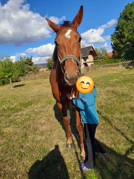 Zum Verkauf steht eine 6-jährige Stute (Stockmaß 1,68m), die durch ihr freundliches und unkompliziertes Wesen im täglichen Umgang überzeugt. Sie ist sehr menschenbezogen, brav im Handling und verladesicher. Auch das kurzzeitige Alleinstehen, beispielsweise beim Grasen, meistert sie problemlos. Abstammend von Don Royal (Vater)* Quarterback (Mutterseite) bringt sie beste dressurbetonte Genetik mit. Zudem ist sie im Zuchtbuch eingetragen und konnte dort mit durchweg guten Bewertungen von 7,5er – 8er Noten in den Bereichen Gang und Exterieur überzeugen. Ausbildungstechnisch befindet sie sich auf solidem L-Niveau und wurde bereits erfolgreich auf Turnieren in Dressurpferdeprüfungen der Klasse L vorgestellt. Unter dem Sattel zeigt sie sich motiviert, leistungsbereit und mit viel Potenzial für die weitere Förderung. Beim Reiten gehört sie jedoch in erfahrene Hände, da sie gelegentlich sensibel reagiert und schnelle Reaktionen zeigen kann. Sie ist dabei stets ehrlich und bockt nicht, benötigt aber einen sicheren und ruhigen Reiter. Aktuell ist sie noch kein Kinderreitpferd und auch im Straßenverkehr nicht vollständig abgeklärt, da sie sich vor schnellen Autos erschrecken kann. Eine tolle Stute für den ambitionierten Reiter, der ein talentiertes Nachwuchspferd mit guter Abstammung und Perspektive sucht.