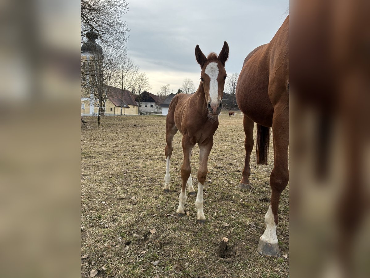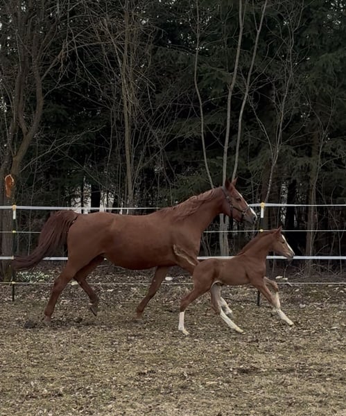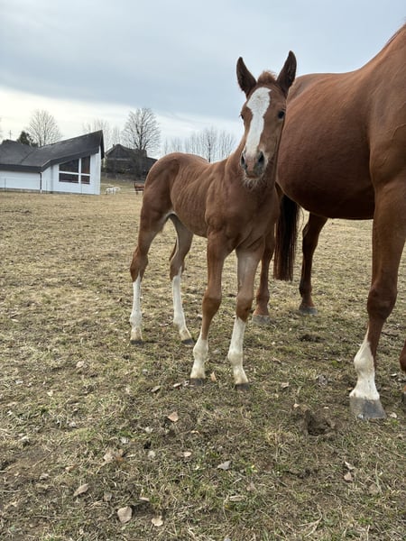 Unsere Bijou sucht ihren Menschen! Unser hübsches Fuchsmädchen zieht jeden Blick auf sich, mit ihren 4 weißen Beinen und der großen Blesse. Sie ist mit einem guten, kräftigen und vor allem korrekten Fundament ausgestattet. Sie taut jeden Tag mehr auf und freut sich über Streicheleinheiten. Bijou wird bestimmt eine tolle Partnerin fürs Springen, aber auch für den Freizeitbereich. Sie hat gute Grundgangarten und ist mit guter Energie ausgestattet, aber besonders hervorzuheben ist der tolle bergauf gesprungene Galopp - hier sitzt der Motor, wo er hingehört. Geschätztes Endmaß +- 1,68m Bei der Abgabe im Herbst 2026 kennt sie das Fohlen ABC, stand schon mehrmals am Hänger, kennt große Maschinen, Kinder, Rinder, Hunde usw. Unsere Pferde kennen verschiedene Haltungsformen und die Fohlen wachsen artgerecht in der Gruppe mit Gleichaltrigen auf. Wir freuen uns darauf, diesen besonderen Nachwuchs aus unserer privaten kleinen Eigenzucht persönlich vorzustellen. Vater ist der 5 Jährige AWÖ Hengst Empire Kalone. Der im perfekten Hengsttyp mit viel Kraft im Rücken stehende Empire Kalone verfügt über 3 hervorragende Grundgangarten. Sein Sprungablauf ist gekennzeichnet von Vermögen, schnellen Reflexen, Bascule und einem explosionsartigen Abdruck im Hinterbein. Empire Kalone gewann seine Veranlagungsprüfung mit Traumnoten. Für die Springanlage, den Gesamteindruck und die Rittigkeit erhielt er 9,0 - vom Fremdreiter dafür sogar die Höchstnote 10! Altersgemäß vorgestellt, konnte er in seiner ersten Turniersaison gleich voll überzeugen und holte sich 22 Platzierungen, darunter 4 Siege. Sein Vater Ermitage Kalone war bei den Weltmeisterschaften der jungen Springpferde DAS Gesprächsthema. Der 12-jährige Hengst von Catoki x Kannan x Veloce de Favi glänzte mit beeindruckenden Runden bei den Belgischen Meisterschaften sowie bei der EM und den Olympischen Spielen. Platzierungen und Siege in Großen Preisen bis 1,65 kann der Hengst auf sein Konto verbuchen. Die Mutter Topia van de Padenborre war selbst im Springsport erfolgreich. Nach ihrer Sportkarriere brachte sie in ihrer züchterischen Laufbahn bereits vier internationale Spitzenpferde u.a. Amazone (1,60), Entre Nous (1,60), Janice (1,50) und Dacapo (1,40). Ihre Mama Bilitis de Vesram lief selbst vor einigen Jahren noch erfolgreich im Springsport. Sie war in der Klasse A siegreich und wurde bis zur Klasse L im Parcour vorgestellt.. Selten habe ich so eine Stute erlebt, die sich durch nichts erschüttern lässt, sie ist im Umgang total brav und unkompliziert und ruhig, lässt sich gut reiten und ist fein an den Hilfen, ich bin mir sicher das hat sie an Bijou weitergegeben.