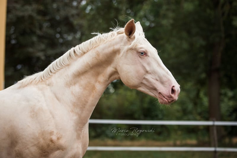 ZfdP (Niemiecki koń) | Cremello | ur. 2015 | 173 cm Zatwierdzony przez ZSSE/Buch I, na stałe zarejestrowany w AES, Zangersheide Genetyka: e/e A/A Cr/Cr Ten ogier zachwyca imponującą jakością ruchu oraz wyjątkową zdolnością skokową pod siodłem. Jego linie rodowodowe są najwyższej klasy – wszystkie konie w jego rodowodzie są uznane i mają dożywotnie certyfikaty sportowe. Jego potomstwo może otrzymać papiery przynajmniej od KWPN, AES, Zangersheide i Belgian Warmblood. W kontaktach jest niezwykle spokojny i niezawodny. W stosunku do klaczy jest bardzo uprzejmy i pokrywa je bezpiecznie i bezproblemowo także w naturalnym kryciu. To wszechstronny, silny sportowo i o mocnym charakterze ogier, który przekonuje zarówno sportowo, jak i hodowlano.