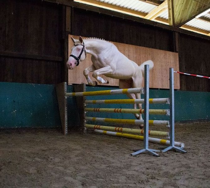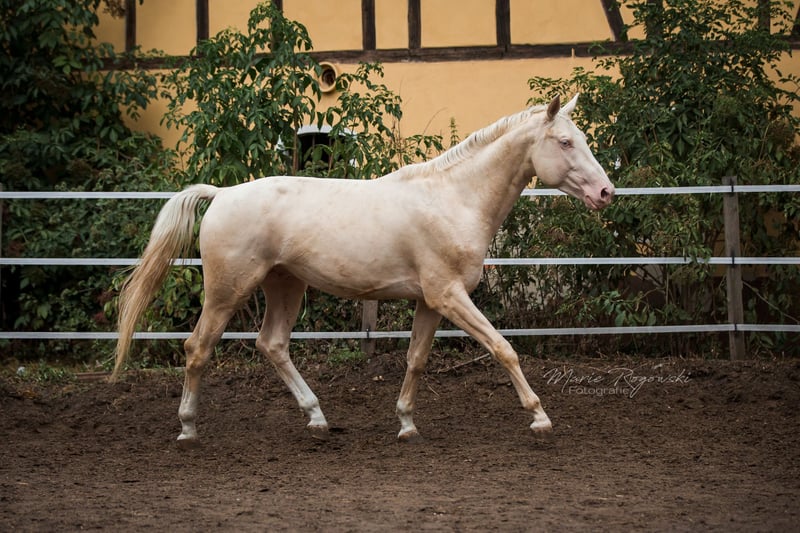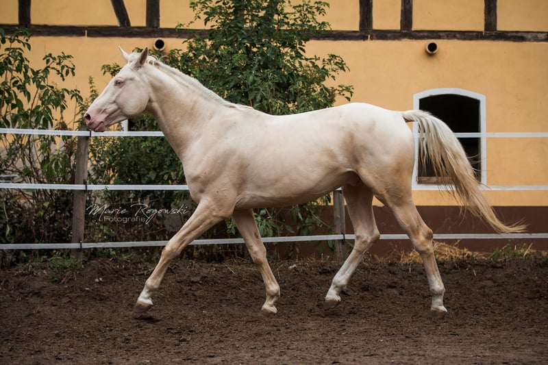 ZfdP (German Horse) | Cremello | Born 2015 | 17.3 hh Approved ZSSE / Book I, permanently approved by AES, Zangersheide Genetics: e/e A/A Cr/Cr This stallion impresses with outstanding movement quality and exceptional jumping ability under saddle. His bloodlines are top-class – all horses in his pedigree are licensed and performance-tested for life. His offspring can receive papers from at least KWPN, AES, Zangersheide, and Belgian Warmblood. In handling, he is exceptionally well-behaved and reliable. He is very friendly and easy to handle with mares and can cover naturally with safety and ease. A versatile, high-performance stallion with a strong character, excelling both in sport and breeding.
