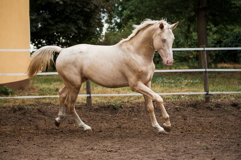 ZfdP (Niemiecki koń) | Cremello | ur. 2015 | 173 cm Zatwierdzony przez ZSSE/Buch I, na stałe zarejestrowany w AES, Zangersheide Genetyka: e/e A/A Cr/Cr Ten ogier zachwyca imponującą jakością ruchu oraz wyjątkową zdolnością skokową pod siodłem. Jego linie rodowodowe są najwyższej klasy – wszystkie konie w jego rodowodzie są uznane i mają dożywotnie certyfikaty sportowe. Jego potomstwo może otrzymać papiery przynajmniej od KWPN, AES, Zangersheide i Belgian Warmblood. W kontaktach jest niezwykle spokojny i niezawodny. W stosunku do klaczy jest bardzo uprzejmy i pokrywa je bezpiecznie i bezproblemowo także w naturalnym kryciu. To wszechstronny, silny sportowo i o mocnym charakterze ogier, który przekonuje zarówno sportowo, jak i hodowlano.