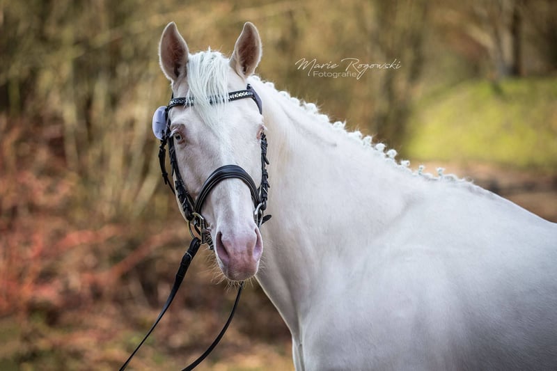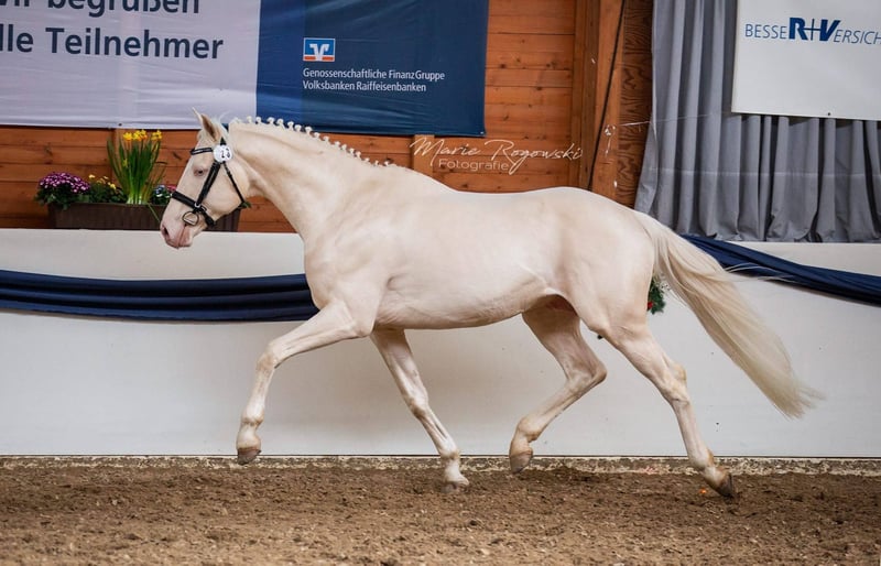 Warmblood stallion in Cremello (double dilute) | born 2010 | 169 cm AES, ZSAA (German Edelblut), Royal Belgian Palomino, licensed Approved for KWPN-A, Zangersheide, IFCE, ISR/Oldenburg N.A. 70-day stallion performance test Neustadt/Dosse + HLP-Sport Marbach Genetics: e/e A/a Cr/Cr ECVM: no findings (2022, international research programme) WFFS, CA, SCID: free Alasdair GF enjoyed many years of sporting success and was placed in cross-country competitions up to class L. In 2015, he was the youngest horse to take 9th place in the ZfDP TOP TEN eventing horses. He has produced colourful, athletically talented offspring worldwide – both in warmblood breeding and in partbred projects. Bred by Gestüt Falkenhorst (Gwendolyn Gregorio), Alasdair comes from a traditional colour and refiner line. His sire, RFF The Alchemist xx, was imported from the USA (Red Fox Farm) and was one of the first double lightened thoroughbreds with Trakehner approval in Germany. Alasdair is performance-tested, strong in character and clear in type. He consistently produces modern, strong-moving foals with substance, conformation and colour – 100% lightening with the appropriate gene combination. As a cremello, he always passes on a cream gene. Due to his genetic background, he is suitable for both classic warmblood mares and projects with breeding goals.