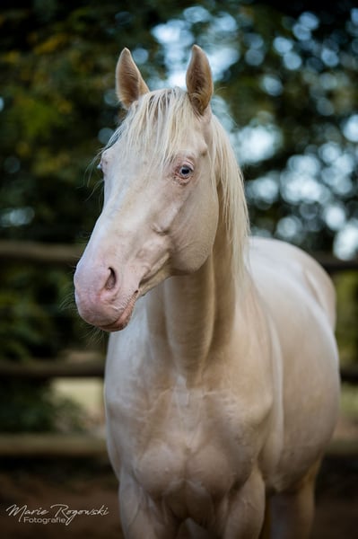 Étalon à sang chaud de couleur cremello (double dilué) | né en 2010 | 169 cm AES, ZSAA (Dt. Edelblut), Royal Belgian Palomino, approuvé Admis pour KWPN-A, Zangersheide, IFCE, ISR/Oldenburg N.A. Test de performance des étalons de 70 jours à Neustadt/Dosse + HLP-Sport Marbach Génétique : e/e A/a Cr/Cr ECVM : sans résultat (2022, programme de recherche international) WFFS, CA, SCID : exempt Alasdair GF a connu de nombreux succès sportifs pendant plusieurs années et s'est classé jusqu'au niveau L dans des épreuves de cross-country. En 2015, il a terminé 9e du classement ZfDP TOP TEN des chevaux de concours complet, alors qu'il était le plus jeune cheval en lice. Il a produit dans le monde entier une descendance colorée et performante sur le plan sportif, tant dans l'élevage de chevaux à sang chaud que dans des projets de partbred. Élevé par le haras Falkenhorst (Gwendolyn Gregorio), Alasdair est issu d'une lignée traditionnelle de chevaux de couleur et d'améliorateurs. Son père, RFF The Alchemist xx, a été importé des États-Unis (Red Fox Farm) et a été l'un des premiers pur-sang doublement éclaircis à être approuvé pour la reproduction en Allemagne. Alasdair est testé pour ses performances, a un caractère fort et un type clair. Il transmet avec une grande constance des poulains modernes, puissants dans leurs mouvements, avec de la substance, des membres solides et une belle couleur - 100 % de clarification avec la combinaison génétique correspondante. En tant que Cremello, il transmet dans tous les cas un gène crème. Grâce à son patrimoine génétique, il convient aussi bien aux juments de sang chaud classiques qu'aux projets visant à améliorer la race.