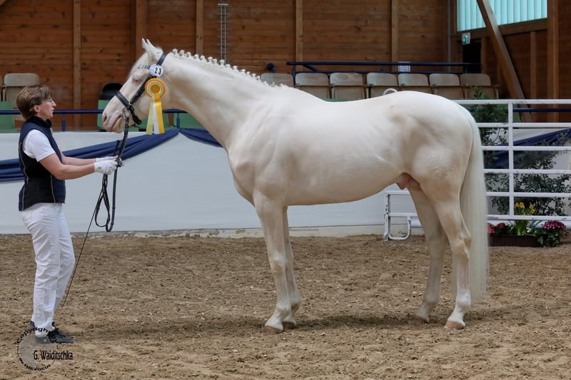 Alasdair GF kann bereits mit Sporterfolgreicher Nachzucht in der Vielseitigkeit glänzen und zeichnet sich nicht nur durch seinen absolut besten Charakter sondern auch durch seine gute Vererbung aus. Hervorzuheben ist natürlich die reinerbige Cremanlage die aus den Nachkommen immer einen Cremträger hervorzaubert ! Aus Fuchsstuten können Palominos fallen und aus Braunen auch Buckskins oder je nach Genetik andere Cremvarianten. Decktaxe ist gestaffelt , 150,-€ Anzahlung und 850,-€ bei Trächtigkeit ! Er deckt alle Farbvarianten zum selben Tarif ! Zugelassen für einige Deutsche sowie Ausländische Verbände !!