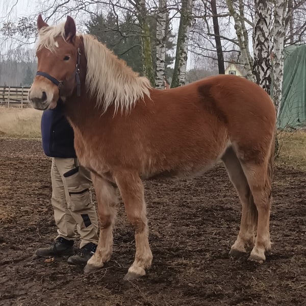 Auf Grund beruflicher Veränderungen sucht eine hübsche Stute, geb. 17.05.2024, ein liebevolles Zuhause. Sie ist jetzt bereits 1,43cm groß und wir schätzen ihr EM so um die 1,48-1,50m, da die Eltern auch so groß waren. Die Mutter ist ein Mix aus Norweger x Schwarzwälder. Der Vater war ein reinrassiger Schwarzwälder. Sie ist für ihr Alter gut ausgebildet. Sie kennt Gebiss, Geschirr, ist beim Vorbesitzer seit Fohlenalter an der Seite der Mutter an der Kutsche gegangen und hat auch schon Schleppe und eine kleine leichte Kutsche gezogen. Bei mir hatte ich wegen fehlendem Equipment nur das Gebiss drauf und das funktioniert super. Straßenverkehr kennt sie, bleibt zwar aufmerksam aber stört sie nicht weiter. Normale Traktoren stören sie auch nicht. Was bei LKW's oder großen Traktoren ist, kann ich leider nicht beurteilen, da wir solche Situationen noch nicht hatten. Sie ist selbstbewusst, neugierig, menschenbezogen und immer händelbar. Neuem gegenüber ist sie aufgeschlossen. Hufe heben, Anbinden, Halftern, Putzen usw. alles kein Problem. Für ihr Alter ist sie schon ziemlich entspannt im Umgang aber braucht jungpferdetypisch am besten täglich Beschäftigung/Bewegung und Jemand, der sich auch durchsetzen kann. Bei entsprechender Ausbildung sehe ich sie auf Grund ihres Charakters als zukünftiges Therapie,- Lehr- oder Schulpferd. Sie hat einen Equidenpass. Die genannten Eindrücke über das Tier, sind Eindrücke des Besitzers und keine Zusicherung, da ein Tier sich unter anderer Hand und in anderer Umgebung auch anders verhalten kann. Ich verkaufe unter Ausschluss von Gewährleistung und Rückgaberecht. Wer sich auf diese Anzeige meldet, erklärt sich damit einverstanden, auf das geltende EU-Recht für Privatverkäufer zu verzichten.