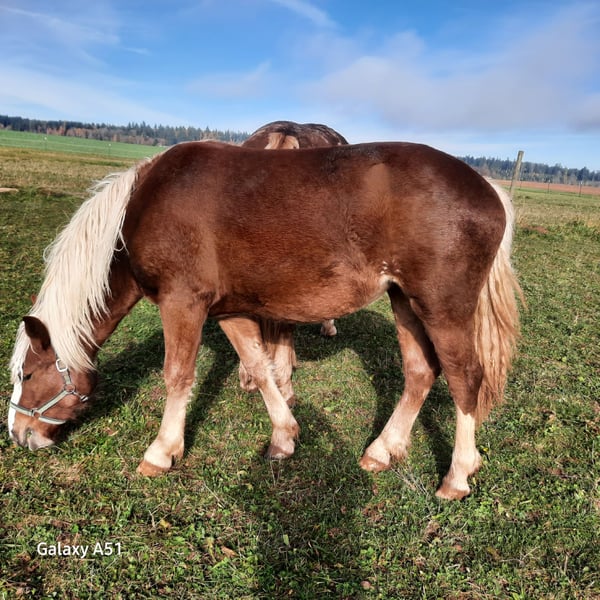 For sale: young Black Forest chestnut mare – perfect for leisure riding! Born in 2024, this charming mare offers great potential and brings joy to everyday riding. She is ideally suited for those seeking a reliable and affectionate horse. She is very curious and eager to learn. Please feel free to contact me for more information or to arrange a viewing.