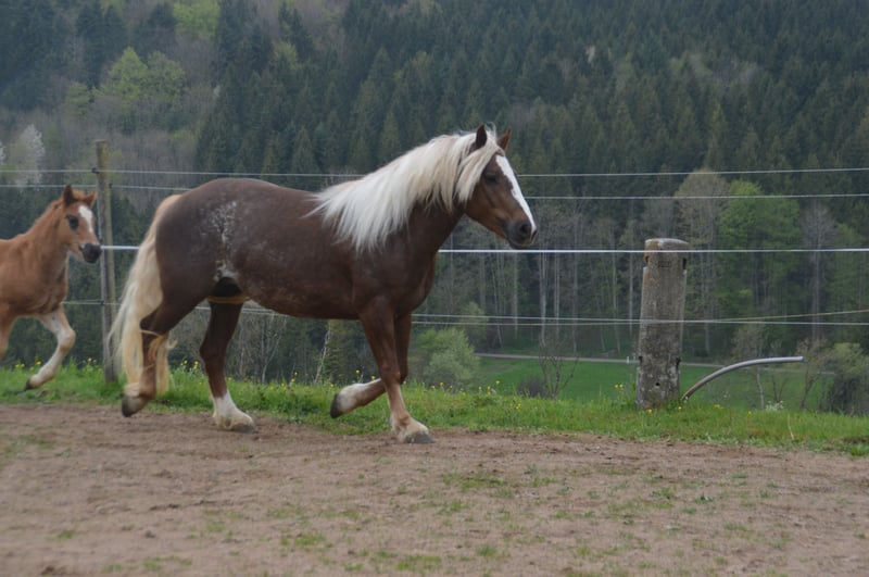 Roberta de Dagobert, issue de Rohana de Wildschütz, aura en février 2026 ses 5 ans. Elle mesure actuellement 149 cm au garrot et a été inscrite cette année au stud-book. Née chez nous, Roberta a grandi au sein de notre troupeau en paddock. C’est une jument amicale, sympathique et élégante. Elle a été mise en selle au printemps de cette année et a réussi avec succès son épreuve de traction en septembre, avec une note de 7,4. Sa capacité de conduite a été particulièrement appréciée par le meneur extérieur, qui lui a attribué la note de 8,5. Elle a été conduite aussi bien en harnais simple qu’en paire, et a démontré son courage ainsi que sa fiabilité lors de déménagements et de présentations en exposition. Elle est principalement montée en extérieur, dans toutes les allures de base, et se comporte toujours de manière correcte. Nous pouvons envisager Roberta comme un excellent cheval de famille ou de loisirs.