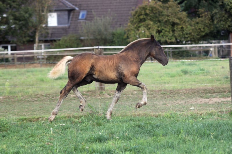 Zum Verkauf steht ein Schwarzwälder Hengstfohlen, geboren am 06.06.2025 Mirado ist von Geburt an täglich an der Hand, kennt putzen, geht brav am Halfter, gibt alle 4 Hufe und kennt natürlich den Schmied, Anbinden und alles was ein Fohlen so können sollte. Er ist dem Menschen stets zugewandt, lässt sich gerne kraulen und liebt es beschäftigt zu werden. Bis auf auf ein paar wenige weiße Haare auf seiner Stirn ist er ansonsten komplett ohne Abzeichen und Kohlfuchs. Mirado ist mit einem weiteren Stutfohlen bisher aufgewachsen und bisher nicht abgesetzt (könnte er aber jederzeit). Auf der Fohlenschau wurde er mit der Fohlenprämie ausgezeichnet und besonders für seinen Typ und die gute Trabbewegung gelobt. Mirado stammt ab von Markus aus der Rapunzel von Don Olewo Mutter Rapunzel ist Staatsprämienstute und legte 2011 erfolgreich ihre Leistungsprüfung ab. Bis 2021 war sie mit mir auf Fahrturnieren bis zur Kl. M erfolgreich. Unter anderem wurden wir 5. Auf der DJM 2021 in Lähden. Neben ihrer Leistungsbereitschaft zeigte sie aber auch bei Festumzügen, als St. Martinspferd oder auch bei Zirzensikvorführungen ihre Nervenstärke und Können. Vater Markus vom HuL Marbach war Reservesiegerhengst seiner Körung, Sieger bei seiner Leistungsprüfung und wurde 2017 Bundessiegerhengst. Mutter, Oma, Tante, Cousine (3. der Bundeskaltblutschau in diesem Jahr und Bundesprämienstute) können vor Ort besichtigt werden. PSSM negativ über die Eltern