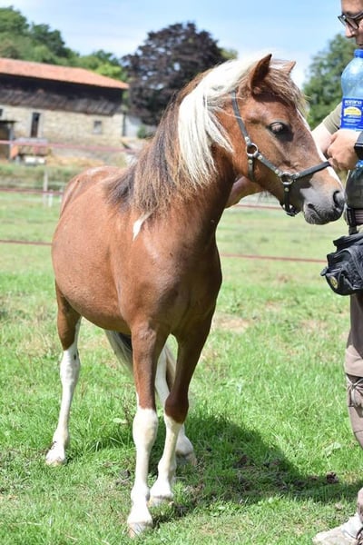 Ouragan es un poni miniatura estadounidense que cumplirá dos años en 2026. Participó en un concurso en línea de modelos y trote, juzgado por un jurado en EE. UU., y obtuvo una excelente clasificación, alcanzando el podio en su primera experiencia. Es un caballo adorable, extremadamente amable y respetuoso. Tiene un trote bonito, le gusta complacer y, sobre todo, adora la compañía humana; siempre está a nuestro lado cuando estamos en el prado con él. Su padre ha sido varias veces campeón de Francia en modelos y trote, así como en enganche, donde también destaca. Ouragan puede dedicarse a la cría o a disciplinas de trabajo en mano, enganche, doma, etc. Debido a su tamaño y constitución, también podría ser montado por un jinete joven y experimentado en el futuro, creo. O, simplemente, sería un magnífico caballo de compañía por su carácter y su dulzura.