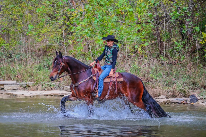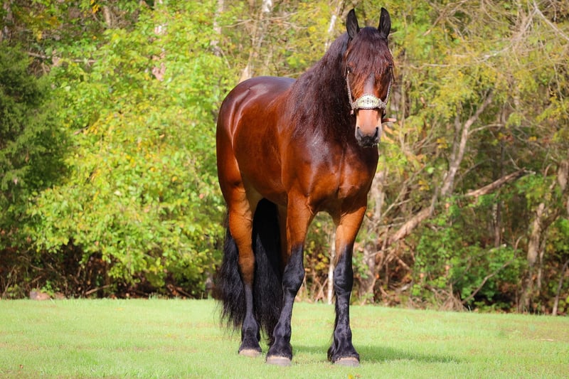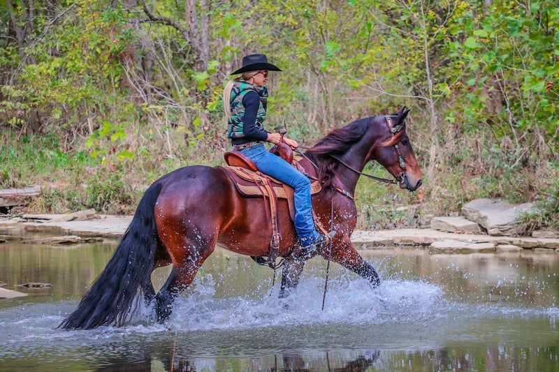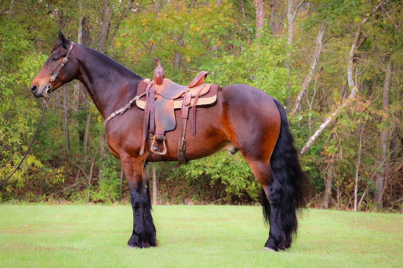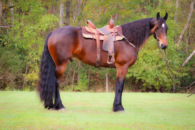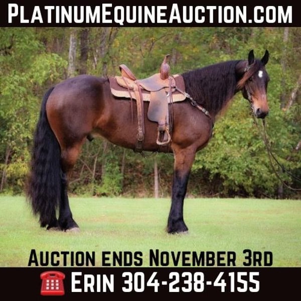 ONLINE AUCTION Place your bids at www.PlatinumEquineAuction.com Starting Bid $3500 Auction ends November 3rd, 2024 Need a new saddle? Check out White Rock Saddles on our website or Facebook! This is “JASPER”, a genuine, gentle, and honest BAY FRIESIAN MORGAN CROSSBRED GELDING that is broke to ride and drive. He is 6 years old and stands 16.1 hands tall. This gelding is extremely intelligent, well trained, civilized, and quiet. He stands to harness, hitch, tack, mount, and groom. He is peaceful to work around, stands for a bath, loads, bathes, and hauls with no fuss. This gelding has had dressage training and been ridden English and Western. He has done some ranch work and has been in the arena. He will move off of leg cues, stop nicely, back up, and lope off quietly. He has no buck and no hump. He will jog and lope circles, he catches his leads, and he is sure footed. This gelding will pick his way through rocky ground, cautiously maneuver down steep hills, and go through deep water with no hesitation. He has been on wagon trains, he will stand to a picket line overnight, he is traffic safe on the roads and not spooky. If you want an extremely handsome horse that is quiet, calm, and safe, don’t miss out on him. He is so personable, he aims to please, and his new owners will love his warm nature, calm demeanor, and intelligent expression. He is also a really nice mover. Located in Flemingsburg, KY. Call HH Horses Erin 304-238-4155. ONLINE AUCTION Place your bids at www.PlatinumEquineAuction.com Starting Bid $3500 Auction ends November 3rd, 2024 Need a new saddle? Check out White Rock Saddles on our website or Facebook!